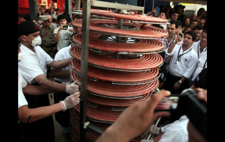 Entretenimiento | Elaborado en el marco de la ''Expo 2011'', el embutido pesó 120 kilos Paraguay logra récord Guinness con una salchicha de 203 metros Fue elaborada por unas doscientas personas que trabajaron por más de cinco horas Por: EFE 15 de julio de 2011 - 19:35 hs La salchicha, de 203.80 metros de largo y 120 kilos, fue elaborada por unas doscientas personas. EFE / ASUNCIÓN DE PARAGUAY (15/JUL/2011).- Paraguay ingresó hoy al Libro Guinness de los récords al registrar el "pancho" (salchicha) más largo del mundo, de 203 metros de largo y 120 kilos, que fue elaborado en el marco de la "Expo 2011". Johanna Hessling, en representación de la organización del Guinness, corroboró la marca y entregó el certificado que acredita esa proeza culinaria a una empresa paraguaya de productos cárnicos que promovió esta iniciativa. La salchicha, de 203.80 metros de largo y 120 kilos, fue elaborada por unas doscientas personas que trabajaron por más de cinco horas y que también hornearon un pan de similar longitud y 145 kilos para acompañarla. Ambos productos fueron cocinados en un recipiente con forma de canaleta construido para la ocasión y con una extensión mayor a la del "pancho" que fue emplazado a lo largo del predio de la Asociación Rural del Paraguay (ARP), en el municipio de Mariano Roque Alonso, cercano a Asunción. En ese recinto se celebra la Feria Internacional de Ganadería, Industria, Agricultura, Comercio y Servicios (Expo 2011), la más importante de Paraguay que abrió sus puertas el pasado 9 de julio. La hazaña gastronómica fue realizada ante un gran contingente de visitantes de la feria y más de 2.000 comensales pudieron saborear el producto que fue distribuido de manera gratuita tras la certificación de rigor. El coordinador general de la Expo 2011, Sixto Miranda, reseñó que el récord obtenido supera al que ostentaba la ciudad española de Málaga, con un "pancho" de 150 metros, según reseñó el diario ABC Color en su edición digital. Miranda celebró ese logro y recordó que la longitud escogida para la salchicha no fue una mera casualidad ya que sirvió además para homenajear los 200 años de Independencia de Paraguay, que se recordó el 14 y 15 de mayo pasado. El 24 de junio último, un grupo de vecinos de Asunción también se destaco, pese a no haber competido por un récords, con la elaboración de un "mbejú" (un panqueque de la gastronomía popular paraguaya) con 500 kilos de almidón de mandioca, 100 kilos de queso y que fue cocinado en una sartén de unos cuatro metros de diámetro. Además, Paraguay había ingresado el 26 de octubre de 2008 al Libro Guinness como el país que registró en la ocasión la mayor cantidad de consumo de asado al aire libre del mundo, con 26.715 kilos de carne y más de 40 mil comensales. Temas Paraguay Curiosidades y absurdos Alimentos Récords Guinness Lee También El peligroso avance del cáncer de colon en México Las fracturas que podría revelar osteoporosis El juego por el que Ohtani hizo recordar al histórico Babe Ruth ¿Cuándo se pide Halloween en México en 2025 y qué día cae? Recibe las últimas noticias en tu e-mail Todo lo que necesitas saber para comenzar tu día Registrarse implica aceptar los Términos y Condiciones