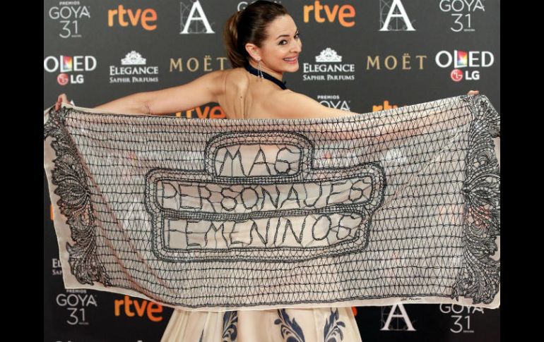 MADRID, ESPAÑA (04/FEB/2017).- La frase "más personajes femeninos" en el cine, escrito en letras bordadas negras sobre un chal blanco roto fue la nota reivindicativa y más comentada en la alfombra roja de los premios Goya.La actriz madrileña Cuca Escribano fue la encargada de pasear su reivindicación a la entrada de la gala de los Goya, donde apareció con el chal sobre las caderas tras lo que se giró ante los fotógrafos y mirándoles desplegó el echarpe para que se pudiera leer la reivindicación.Escribano aseguró que es el primer año que no trabaja en cine y recordó que, según un estudio de la asociación de cineastas CIMA, solo un 20 por ciento de los papeles que se escriben son para mujeres. "El cine tiene que contar la vida y nosotras también existimos, hay demasiada testosterona" dijo.Actualmente, Escribano está de gira con la obra de teatro "El jurado", que también produce.En la misma línea que Escribano, la productora de una de las películas favoritas de esta noche, "Tarde para la ira", Beatriz Bodegas, confesó que "no recibe proyectos con papeles potentes para mujeres"."No hay tantos, es verdad, pero cuando entra la creatividad el sexo desaparece", subrayó a su entrada a la gala.
