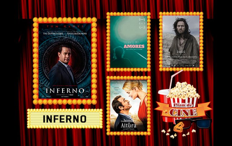 GUADALAJARA, JALISCO (13/OCT/2016).- Este fin de semana, la cartelera de cine de nuestra ciudad se renueva con la llegada de seis películas. Checa el comentario de Arturo Garibay sobre cada una de ellas y arma tu Plan de Cine.Tom Hanks regresa con “Inferno”, la tercera parte de la franquicia formada por “El código DaVinci” y “Ángeles y Demonios”. También tenemos el estreno del documental “Llévate mis amores” y la francesa “Un hombre a la altura”.Esta semana también llega a los cines “Los últimos días en el desierto”, la película de terror “La enviada del mal” y “Mentes Maestras”.¡Tenemos regalos!20th Century Fox tienen playeras de "Miss Peregrine y los niños peculiares", sigue la dinámica en nuestras redes sociales para ganar una de ellas.¡Tenemos boletos!Universal Pictures y Plan de Cine te invitan a la premiere de 'Ouija: El origen del mal". Sigue la dinámica en nuestras redes sociales para ganar un pase doble.No te pierdas una nueva entrega de 'Plan de Cine' todos los jueves en EL INFORMADOR.