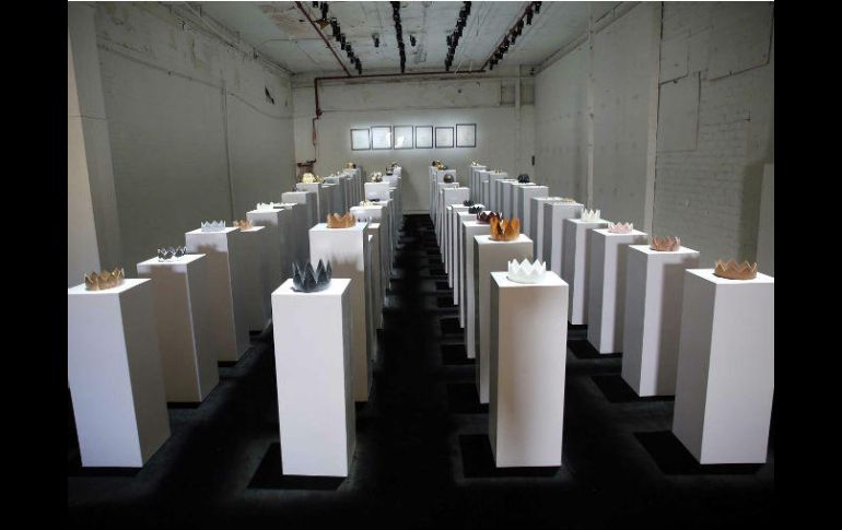 La muestra se compone de coronas realizadas con materiales como metales preciosos, mármol, madera, metal y nylon, mismas que están acomodadas en pedestales alineados.