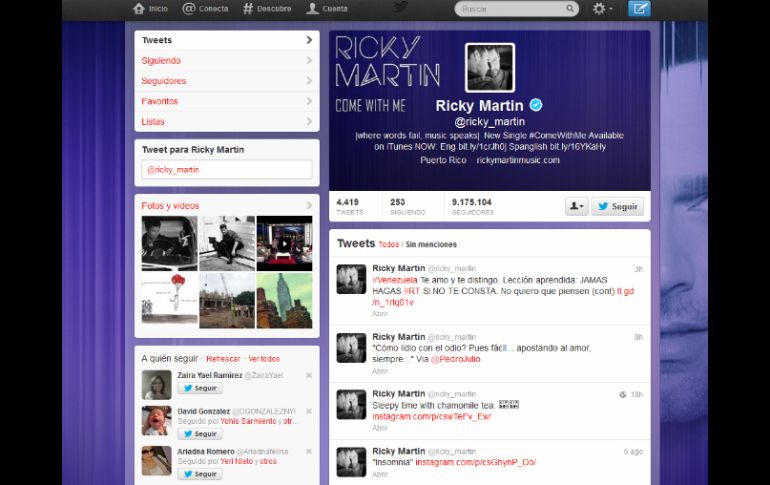 El video, colgado este martes en la red social, mostraba a Maduro en el acto de entrega, la pasada semana, del premio Rómulo Gallegos en Caracas en un momento en que hablaba de Cuba mientras tomaba la bandera de Puerto Rico."Maduro confunde bandera de Puerto Rico con la de Cuba", indicó Martin en el texto de su mensaje.El presidente venezolano pidió hoy a Ricky Martin en un acto oficial que rectificase "mundialmente" porque se dejó "llevar por una manipulación" y mostró unas reproducciones de las banderas de Cuba y otra de Puerto Rico que dijo que le iba a regalar al artista."Lo digo de buena fe, Ricky, lo digo de buena fe porque te aprecio y te admiro como artista mundial, lo digo de buena fe porque tú colocaste en tu Twitter ayer una manipulación", indicó el gobernante venezolano.Maduro explicó que el video difundido en el Twitter del artista correspondía a un momento en el que hablaba de Cuba cuando estaba pasando al tema de Puerto Rico y agarró la bandera de la isla caribeña y la unió a la de Venezuela."Y dije que por eso es que más temprano que tarde, Ricky Martin, yo te convoco a que tu tomes tu bandera puertorriqueña y más temprano que tarde podamos acompañar a Puerto Rico para declararse ahora sí definitivamente una república libre, independiente", indicó Maduro.Una vez acabada la petición de rectificación de Maduro, Ricky Martin difundió otro mensaje en Twitter diciendo: "#Venezuela Te amo y te distingo. Lección aprendida: JAMAS HAGAS #RT SI NO TE CONSTA. No quiero que piensen que hubo intención de intervenir en sus temas políticos. Nunca me expreso para ofender sino compartir. #PAZ".Maduro tomó este mensaje y lo reenvío señalando: "Una lección de humildad de @ricky_martin para tod@s, te felicito. Venezuela también te ama. Viva Puerto Rico..." y adjuntó una fotografía del cantante.El presidente venezolano había señalado previamente durante su reclamo a Martin que al cantante "lo engañaron" con el video; "porque ustedes saben que el imperio ahora dirigió todo contra mi y entonces ellos hacen campañas de rumores, de mentiras", agregó."Ojalá, como tú te sientes orgulloso de tu bandera yo también me siento orgulloso de tu bandera de Puerto Rico (...) pero me sentiría más orgulloso de ti Ricky Martin, querido compatriota caribeño, si no solo tuvieras bandera si no tuvieras patria libre también", indicó Maduro, lanzando vivas a la independencia de Puerto Rico."Aquí te tengo tu regalo Ricky Martin", indicó, mostrando los banderas y afirmando que el cantautor cubano Pablo Milanés se refirió al estado asociado a Estados Unidos como el "ala que cayó al mar, que no pudo volar", y el prócer cubano José Martí habló de Cuba y Puerto Rico como las dos alas de un pájaro."Yo te invito a que volemos juntos al mismo cielo, yo invito a Ricky Martin a que volemos juntos al cielo de la independencia", señaló el gobernante.NAVEGA:https://twitter.com/ricky_martin