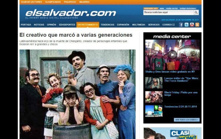 Entretenimiento | Los principales diarios locales lamentan y resaltan la muerte del cómico Rinde AL homenaje a 'Chespirito': Prensa de El Salvador Los principales diarios locales lamentan y resaltan en primera plana el deceso de ''Chespirito'' en México Por: NTX 29 de noviembre de 2014 - 08:54 hs SAN SALVADOR, EL SALVADOR (29/NOV/2014).- América Latina rinde homonaje al fallecido actor, comediante y productor de televisión, el mexicano Roberto Gómez Bolaños "Chespirito", quien dio vida a los personajes del "Chavo del 8" y el "Chapulin Colorado", que hicieron reír a chicos y grandes, destacó hoy la prensa salvadoreña. Los principales diarios locales lamentaron y resaltaron en primera plana el deceso de "Chespirito" en México, un cómico que marcó varias generaciones. "Adiós Chespirito", tituló en grande y en primera plana El Diario de Hoy, al reseñar en fotografía al también escritor y dar a conocer la historia artística de Roberto Gómez Bolaños. La publicación recuerda cuando el actor mexicano y su esposa, la también actriz Florinda Meza, visitaron El Salvador en 2005. "1920-2014. Murió Chespirito", tituló por su parte el periódico La Prensa Gráfica, al resaltar la figura del actor en una amplia fotografía. "Hasta siempre Chespirito", agregó el matutino, al indicar que tres generaciones de América Latina, disfrutaron y se rieron con los personajes de televisión de Gómez Bolaños. "El Chavo del 8, su hijo más célebre, fue el que dio la mayor popularidad a Gómez Bolaños, uno de los más grandes comediantes que ha tenido América Latina", escribió el rotativo. "¡Inolvidable!". Sin querer queriendo, Roberto Bolaños recorrió las casas y vecindades de toda América Latina", anotó La Prensa Gráfica en un póster que pública del Chapulín Colorado, otro de sus personajes. Los medios de comunicación, prensa, radio y televisión continúan informando sobre el deceso de ''Chespirito'' ocurrido la víspera en su residencia un balneario de Cancún. Temas Farándula Decesos actores Decesos personalidades del arte Roberto Gómez Bolaños Chespirito Lee También Fallece John Lodge, bajista de The Moody Blues Andrew Garfield sueña con unirse a “Wolverine” en Marvel Angelina Jolie exige compensación a Brad Pitt Belinda denuncia a Lupillo Rivera Recibe las últimas noticias en tu e-mail Todo lo que necesitas saber para comenzar tu día Registrarse implica aceptar los Términos y Condiciones