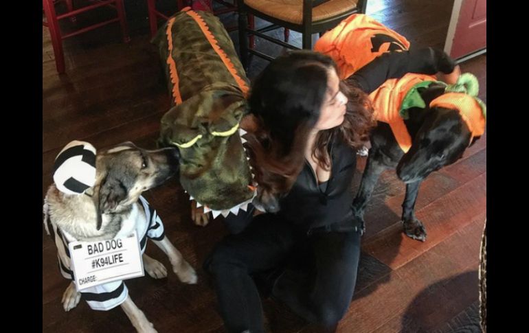 CIUDAD DE MÉXICO (31/OCT/2016).- La actriz mexicana Salma Hayek está lista para celebrar Halloween junto a sus mascotas.En una fotografía que compartió en Instagram aparecen tres perros de la actriz.Las mascotas aparecen disfrazadas de dinosaurio, presidiario y calabaza.Hayek es amante de los animales y ha confesado que tiene alrededor de 50 mascotas en su casa, incluidos caballos, perros y loros.La semana pasada llamó la atención en Instagram al compartir una imagen de la portada de la revista “GQ” en la que lució su famoso escote.