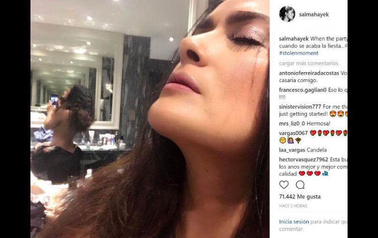 CIUDAD DE MÉXICO, (25/JUN/2017).- La actriz mexicana Salma Hayek publicó en su cuenta de Instagram una imagen donde luce su figura "topless".En el primer plano de la imagen que Salma usó para mostrar cómo luce después de una fiesta, se ve un acercamiento al rostro de la actriz.Como fue tomada frente a un espejo, la fotografía muestra al fondo la figura de Salma, quien se estaba quitando un vestido, que sólo la cubría de la cintura para abajo.La imagen tiene más de 500 comentarios y más de 47 mil "me gusta".