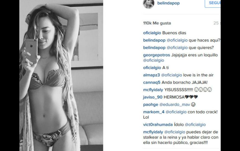 Entretenimiento | El futbolista y la cantante se han escrito polémicos comentarios en la red social 'Te quiero a ti', le dice Gio Dos Santos a Belinda en Instagram El futbolista y la cantante se han escrito polémicos comentarios en la red social Por: EL INFORMADOR 6 de abril de 2016 - 10:46 hs '¿Qué haces aquí?, ¿Qué quieres?', le contesta la intérprete al jugador. INSTAGRAM / belindapop GUADALAJARA, JALISCO (06/ABR/2016).- El futbolista Giovani Dos Santos y la cantante Belinda, que fueron pareja en 2009, se han escrito polémicos comentarios en Instagram. Todo comenzó cuando el jugador entró a la cuenta de la famosa y en un video publicado en el que ella aparece lanzando un beso, él le escribió: ¿Para mí?. La artista lo ignoró, pero sus fanáticos le escribieron comentarios en los que le dejaban claro que ella ya no lo tomaría en cuenta. Gio no se dio por vencido y en otra foto publicada hace semanas, en la que Belinda luce un bikini, él la saludó con un 'buenos días', pero esta vez fue diferente pues la guapa intérprete sí le contestó con un: '¿Qué haces aquí?', ¿Qué quieres?, a lo que dos Santos le respondió 'A ti'. Anteriormente, la ex pareja ya había protagonizado una polémica en redes sociales cuando se enviaban indirectas a través de fotografías y 'hashtags'. Temas Farándula Giovani dos Santos Belinda Instagram Escándalos en redes sociales Lee También Esto dijo el abogado de Belinda tras declaraciones de Lupillo Rivera WhatsApp prepara uno de los mayores cambios en su historia reciente La Granja VIP: Lolita Cortés sorprende con respuesta indiferente a la llegada de Sandra Itzel Concierto de "El Tri" se suspende un momento por caída de una pantalla (VIDEO) Recibe las últimas noticias en tu e-mail Todo lo que necesitas saber para comenzar tu día Registrarse implica aceptar los Términos y Condiciones