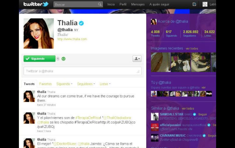 Entretenimiento | Su compañera: Laura Zapata Thalía comparte en redes sociales algunas de sus aventuras La actriz y cantante se mantiene como una de las artistas latinas que más contacto tiene con seguidores mediante Twitter Por: NTX 6 de enero de 2012 - 21:29 hs En Twitter, la también actriz de melodramas como María la del barrio, dio a conocer algunos de los momentos de su vida. ESPECIAL / MIAMI (06/ENE/2012).- La cantante mexicana Thalía se mantiene como una de las artistas latinas que más contacto tiene con sus fans mediante las redes sociales, y aprovechando esto compartió con su público las aventuras y el tiempo que pasa al lado de su hermana, la actriz Laura Zapata. En Twitter, la también actriz de melodramas como "María la del barrio", dio a conocer algunos de los momentos de su vida, así como sus bebidas favoritas en clima frío: "Nada mejor que un vaso de leche caliente con miel de agave azul, antes de dormir! MiFavorito! Miel de abeja, agave o azúcar? Cuál prefieres tú?". Asimismo, aprovechó este espacio para expresarle su cariño a cada una de las personas que la siguen en esta red social, y que además han apoyado su carrera como actriz y cantante. "Tengo un amor virtual gigantesco por mis twiteros! Conexiones cibernéticas 2012! Tu que sientes? Ponle UNA palabra a tu sentimiento ahora!!!", es otro de los comentarios de la intérprete. Thalía también aprovechó el momento para dar a conocer a sus fans que celebra el Día de los Reyes Magos: "Casi casi me sale el muñequito de la rosca de reyes! Me salve de hacer tamales! Por una cabeza...". El twitter de Thalía fue comentado por su hermana Laura Zapata con textos que muestran el cariño que se tienen; además publicaron fotografías de algunas aventuras que han pasado juntas a últimas fechas. Una de ellas muestra a la intérprete de "Equivocada", vaciando un garrafón de gasolina en su vehículo "Thalia jajaja! Y tu riéndote!!! y sacando fotos!?? RT @LAURAZAPATAM: @thalia. Te amo hermana que divertido!!!Jajajaja !!!" expresó la cantante al respecto. En otro mensaje, Thalía pone en evidencia a Laura Zapata, al fotografiarla mirando su dispositivo móvil y comentar: "Ya la perdimos!!!.....poseída por el twitter!!!". Estas son algunas de las situaciones que la cantante y actriz comparten con el público, además de ofrecerle momentos de buen humor con la sección "terapia de risa", que consta en el mejor y peor chiste que ha leído hasta el momento de sus fans. Temas Farándula Thalía Twitter Recibe las últimas noticias en tu e-mail Todo lo que necesitas saber para comenzar tu día Registrarse implica aceptar los Términos y Condiciones