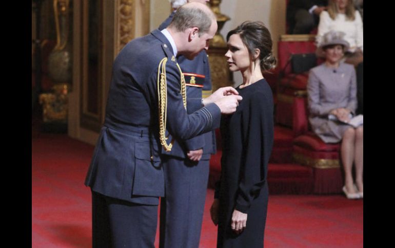 LONDRES, INGLATERRA (19/ABR/2017).- La diseñadora de moda británica Victoria Beckham recibió de manos del príncipe Guillermo, nieto de la reina Isabel II, la distinción Orden del Imperio Británico (OBE) en un acto celebrado en el palacio de Buckingham en Londres.La ex cantante de pop, casada con el ex jugador de fútbol David Beckham, fue condecorada en la residencia oficial de la familia real británica por su carrera de 17 años en la industria de la moda, donde se ha convertido en uno de los nombres más respetados.Victoria Beckham, que estuvo acompañada durante la ceremonia por su marido y por sus padres, indicó tras recibir el OBE que se sentía "orgullosa de ser británica" y que recibir el honor del duque de Cambridge había sido "un auténtico placer y un honor"."Si tienes grandes sueños y trabajas duro puedes lograr grandes cosas", comentó a los medios locales la popular diseñadora, de 43 años.La ahora diseñadora, que formó parte del conocido grupo de música pop británico "Spice Girls", también indicó que se sentía "muy feliz de compartir esta ocasión tan especial" con sus padres y su esposo al agregar que "sin su amor y apoyo nada de esto sería posible".El matrimonio formado por Victoria y David Beckham -con cuatro hijos: tres niños y una niña- es uno de los más exitosos a nivel comercial de este país.En la ceremonia, otras celebridades que también hoy recibieron sendas condecoraciones reales fueron la atleta Jessica Ennis-Hill, que fue nombrada Dama del Imperio británico y el oscarizado actor Mark Rylance -ganador por "Bridge of Spies" ("El puente de los espías")-, que fue nombrado Caballero por sus servicios al teatro.