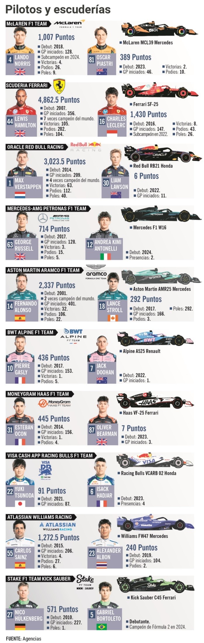 Tras el fichaje del siglo, ¿vivirá la Fórmula Uno una temporada de ensueño? Para su 75 aniversario, el campeonato se ha regalado traer de vuelta los duelos entre Lewis Hamilton, que buscará un octavo título ahora con Ferrari, y Max Verstappen, dominador los cuatro últimos años con Red Bull, con permiso de McLaren, vigente campeón de constructores.La escudería británica, que no gana el título de pilotos desde la primera corona de Hamilton en 2008, se presenta como el gran rival a vencer, gracias al coche que dominó la segunda parte de la pasada temporada y a la experiencia acumulada ya por sus jóvenes pilotos, el británico Lando Norris y el australiano Oscar Piastri.“Ya no tenemos excusas. El año pasado demostramos que teníamos todo lo necesario para luchar por lo máximo y ser los mejores. Si no lo somos en el inicio de la temporada es que no somos lo suficientemente buenos”, sentenció Norris.El desarrollo de esta historia tiene su arranque en Melbourne, donde este fin de semana se correrá la primera de 24 carreras que tendrá la temporada.AFPAGENDAJueves 13Viernes 14Sábado 15CANDIDATOS AL TÍTULOFerrari se ha movido entre la prudencia y la confianza después de sus pruebas en Bahréin.“Estos días han ido muy bien y hemos progresado bien. Hemos conseguido obtener mucha información útil para mejorar antes del inicio de la temporada. Estoy deseando disputar la primera carrera en Melbourne”, señaló Hamilton, quien a sus 40 años parece un niño ilusionado con su llegada a la Scuderia.Su llegada a Maranello ha generado una enorme expectación y ha disparado la ilusión de los “tifosi”, a la vez que motivó la salida de Carlos Sainz, que fichó por Williams.Hamilton sueña con un octavo título mundial, que le permita quedar en solitario en lo alto del palmarés y superar la igualdad a siete que tiene con el mítico Michael Schumacher.Pero Ferrari no consigue que ninguno de sus pilotos se corone desde 2007 con Kimi Raikkonen. Su último título de constructores fue un año después, en 2008.Hamilton se proclamó “revitalizado” en el fastuoso lanzamiento de la temporada de la F1. Las expectativas de los “tifosi” de Ferrari son tan altas que algunos talaron un árbol para ver mejor a Hamilton probar el nuevo modelo SF-25.“Sé cómo se ve y se siente un equipo ganador”, dijo el mes pasado. “La pasión aquí es como nada que hayas visto. Tienen absolutamente todos los ingredientes que necesitan para ganar un campeonato mundial. Y se trata sólo de juntar todas las piezas”.COMPETENCIA DIRECTAEn este último año de reglamentación técnica antes del gran cambio previsto para 2026, donde los motores y chasis tendrán que ser muy diferentes a los actuales, los protagonistas del paddock esperan una cierta continuidad respecto a la anterior temporada, al menos en su tramo final, cuando cuatro equipos y hasta siete pilotos lograron ganar carreras.Los tres días de ensayos de pretemporada disputados en Bahréin a finales de febrero mostraron que McLaren parte con un poco de ventaja respecto a Red Bull, Ferrari y Mercedes, sus tres principales adversarios, que han reconocido esa superioridad.“Todavía tenemos trabajo. Los otros equipos quieren también progresar, creo que por ahora hay una escudería por delante. Ese equipo es naranja”, estimó la pasada semana Verstappen.“Los ensayos no fueron tan bien como esperábamos, pero es mejor tener problemas ahora que tenerlos ya en la línea de salida. Habíamos venido aquí a entender mejor el coche, que no ha respondido siempre como deseábamos, pero vamos en la buena dirección”, reconoció Pierre Waché, el director técnico francés de Red Bull.El curso pasado, después de anotarse siete de las primeras diez carreras, Verstappen no se impuso en ninguna de las siguientes 10; y acabó el año con sólo nueve triunfos. Motivo por el que más de uno quiso ver cerca el final de su reinado.Pero, hoy por hoy, el neerlandés será de nuevo el hombre a batir. Si gana otro campeonato igualará las cinco coronas del argentino Juan Manuel Fangio y ya sólo tendrá por delante a los dos séptuples campeones del mundo, Hamilton y el alemán Michael Schumacher. Al que también emularía, ya que el “Kaiser” es el único que ha logrado encadenar cinco títulos, todos con Ferrari.CARAS NUEVASLa temporada 2025 está marcada también por la presencia de seis nuevos pilotos como titulares en la Fórmula Uno. Es decir, casi un tercio de la parrilla.Tres de ellos nunca han competido en esta competición: el francés Isack Hadjar (Racing Bulls), el brasileño Gabriel Bartoleto (Sauber), campeón de F2 el año pasado, y el prodigio italiano de 18 años Andrea Kimi Antonelli (Mercedes).Los otros tres ya participaron al menos en un Gran Premio. Es el caso de Jack Doohan (Alpine), Oliver Bearman (Haas) y Liam Lawson (Red Bull).Cambiar en 2025 brinda a los equipos la oportunidad de permitir que los jóvenes adquieran experiencia antes de que las reglas de diseño de los monoplazas cambien radicalmente para 2026.