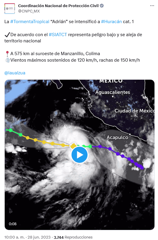 México | Huracán Adrián EN VIVO: Noticias y actualizaciones del ciclón en el Pacífico Estas son las actualizaciones, reportes de lluvias, inundaciones y otras afectaciones por "Adrián" en México Oralia López 29 de junio de 2023 - 07:00 hs "Adrián" se aleja de México 2023-06-29 08:55El huracán "Adrián" se localizará al sur de las costas de Baja California Sur, continuará su movimiento hacia el oeste, alejándose gradualmente y dejando de afectar al territorio nacional. Finalmente, continuará el ambiente caluroso a muy caluroso sobre estados del noroeste, norte y noreste de México. "Adrián" acaba con el calor en la ZMG; temperatura ha bajado al menos 10 grados 2023-06-29 08:50Las lluvias han traído consigo también la disminución de la temperatura y al menos en lo que respecta a la Zona Metropolitana de Guadalajara (ZMG) se reporta una baja de por lo menos 10 grados. El pasado 21 de junio se reportaron en la ZMG, por ejemplo, los termómetros alcanzaron 39 °C, mientras que para el día de hoy, según el Instituto de Astronomía y Meteorología (IAM) de la UdeG se pronostican entre 27 y 29 como máximo, a la par de una alta probabilidad de lluvias a lo largo del día. Estos son los efectos que ocasionará "Adrián" en Jalisco 2023-06-28 18:34El primer huracán de este 2023 en el Oecáno Pacífico ya llegó. "Adrián" se convirtió en huracán categoría 1 este miércoles. La Unidad Estatal de Protección Civil aseguró que vigila el comportamiento del huracán “Adrián”, principalmente en las costas del Estado. La dependencia estatal informó que no representa peligro directo para Jalisco, aunque sí generará lluvias durante las siguientes horas. Estos son los estados que serán afectados por el huracán "Adrián" 2023-06-28 11:00Aunque no tocará tierra, el SMN prevé que en las próximas horas las bandas nubosas de "Adrián" ocasionen lluvias "muy fuertes", de 50 a 75 milímetros, en los estados de Colima, Guerrero, Jalisco y Michoacán, además de "fuertes", de 25 a 50 milímetros en Nayarit. PC indica que "Adrián" representa peligro bajo para México, pero dejará lluvias 2023-06-28 10:30De acuerdo con autoridades de Protección Civil, el ciclón representa peligro bajo para México, y se aleja de territorio nacional. "Adrián" se intensifica a huracán categoría 1 2023-06-28 09:34Esta mañana, la "Adrián" se intensificó a huracán categoría 1, informó el Servicio Meteorológico Nacional (SMN). Se esperan lluvias de fuertes a muy fuertes en Jalisco, Colima, y Michoacán. Temas Huracanes adrián Ciclones Clima Fenómenos Naturales Lluvias Conagua Lee También "Jerry" avanza en el Atlántico mientras "Priscilla" se desvanece "Raymond" aparecerá en horas y afectará a estos estados por su trayectoria Huracán "Priscilla" deja cubiertas de arena zonas peatonales de Mazatlán TODO sobre el frente frío que perturbará a México en horas