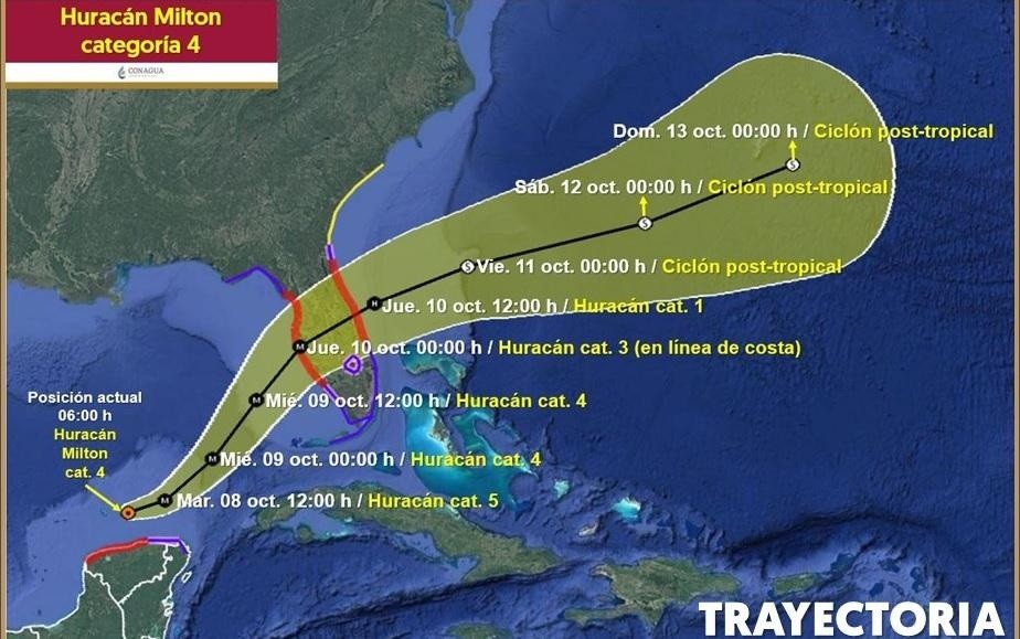 México | Huracán 'Milton' EN VIVO: Trayectoria y noticias al momento El huracán "Milton" se intensificó rápidamente a la máxima categoría y ocasionará lluvias muy fuertes a puntuales torrenciales en la península de Yucatán y el oriente del país El Informador 8 de octubre de 2024 - 06:30 hs Milton apunta a Florida siendo aún muy peligroso 2024-10-08 06:30La Comisión Nacional del Agua informó poco después de las 6:00 horas que el huracán Milton continúa como categoría 4 en la escala Saffir-Simpson. Su centro se ubicaba a 120 kilómetros al norte de Dzilam y a la misma distancia al noroeste de Río Lagartos, ambas localidades de Yucatán. Por su parte, el Centro Nacional de Huracanes de los Estados Unidos advirtió que se espera que el meteoro siga siendo extremadamente peligroso el miércoles por la noche, cuando impacte la Florida. Recomendó a los habitantes aprovechar estos días para prepararse e incluso evacuar, según lo indiquen las autoridades locales. Milton pierde fuerza y se degrada a huracán de categoría 4 2024-10-08 01:00Milton perdió fuerza a primera hora del martes y se convirtió en un huracán de categoría 4 y se ha descartado que su centro impacte las costas de Yucatan, pero sigue avanzando hacia Florida y amenaza Tampa Bay con una peligrosa marejada ciclónica, lo que provocó la emisión de órdenes de evacuación y aceleraró la limpieza de los daños causados por Helene, que azotó la misma zona costera hace poco menos de dos semanas. AP X/conagua_clima Sigue EN VIVO la trayectoria de "Milton" El Tren Maya suspende operaciones por el paso del huracán 'Milton' Con el huracán 'Milton' acercándose a tierras mexicanas, las autoridades del Tren Maya han decidido suspender de manera temporal el servicio en el tramo que une las estaciones de San Francisco de Campeche y Cancún. Esta acción se toma con el fin de priorizar la seguridad tanto de los pasajeros como del personal que opera en la línea. Desde Mérida, Yucatán, se ha activado el Centro de Monitoreo y Operaciones de Emergencia, que se encargará de coordinar las estrategias de seguridad y evaluar el impacto que pueda tener este fenómeno natural en la región. Claudia Sheinbaum alerta por huracán 'Milton' y llama a buscar refugio 2024-10-07 09:30La presidenta Claudia Sheinbaum alertó a través de un video publicado en su cuenta de X sobre la cercanía del huracán "Milton" de categoría 5 hacia Yucatán. Además, no descartó que el fenómeno pueda tocar tierra entre Celestún y Progreso. Ante ello, la mandataria hizo un llamado a la población de buscar refugio en albergues. Comparto información sobre la trayectoria del huracán Milton de categoría 5. Se prevén fuertes lluvias y vientos, podría tocar tierra entre Celestún y Progreso, en Yucatán. Les pedimos estar atentos a las instrucciones oficiales de los gobiernos federal y estatal. pic.twitter.com/W9BvAiCbL3 — Claudia Sheinbaum Pardo (@Claudiashein) October 8, 2024 SUN Las mascotas también son evacuadas en Yucatán por el huracán "Milton" 2024-10-07 20:18Las redes sociales se han llenado de fotografías y vídeos donde se puede observar a los habitantes llevando a sus perros, gatos y hasta pericos consigo. Las imágenes muestran camionetas llenas de transportadoras de animales, así como ciudadanos formados con sus maletas, familias y mascotas con sus correas. Refugios de animales también han evacuado exitosamente a las mascotas que se encontraban en las instalaciones. Tal es el caso del albergue “Alma Verde Holbox”, el cual puso a salvo a más de cincuenta mascotas que corrían peligro en el asentamiento, tras el anuncio del paso del Huracán Milton. Así luce el malecón de Campeche ante la marejada ciclónica 2024-10-07 07:10 ���� Durante esta tarde, el malecón de Campeche registró los primeros efectos de marejada ciclónica con el acercamiento del #Huracán #Milton a la península de Yucatán.pic.twitter.com/9I0MKupEqK — SkyAlert Storm (@SkyAlertStorm) October 8, 2024 Estados donde suspenden clases por paso de "Milton" 2024-10-07 18:48La Secretaría de Educación Pública (SEP) dio a conocer los estados en donde se suspenderán las clases debido a la cercanía del huracán “Milton”, el cual actualmente es categoría cinco, considerada la más peligrosa. De acuerdo con la Secretaría de Educación del Gobierno del Estado de Yucatán se suspenden las clases en de todas las escuelas de dicho estado, en todos los niveles educativos los días siete y ocho de octubre, debido a la cercanía del huracán “Milton”, aunque no confirmaron si se retomaran las clases el miércoles o no, por lo que la dependencia reiteró la importancia de mantenerse atentos a los avisos oficiales, hasta el momento el regreso a las aulas es hasta nuevo aviso. Por su parte el Gobierno de Quintana Roo informó que a partir de mañana, ocho de octubre se suspenden las clases en todos los niveles educativos en los municipios de Cozumel, Puerto Morelos, Benito Juárez, Isla Mujeres, y Lázaro Cárdenas, en el resto de municipios las clases continúan de manera normal. Florida ordena evacuaciones y trata de limpiar escombros 2024-10-07 18:40Los habitantes de la costa de Florida en el Golfo de México se apresuraban el lunes a prepararse para la llegada de un huracán de categoría 5, mientras cuadrillas de trabajadores se esmeraban en retirar las pilas de escombros que dejó el huracán Helene hace dos semanas y las carreteras se llenaban de gente que huía. El ojo del huracán Milton podría tocar tierra el miércoles en la región de Tampa Bay, que no ha sufrido el impacto directo de un huracán de categoría 3 o mayor en más de un siglo. Los científicos prevén que el sistema se debilitará ligeramente antes de tocar tierra, aunque podría conservar la fuerza de huracán a medida que atraviese Florida en dirección al océano Atlántico. Esa trayectoria eximiría de sus efectos a otros estados devastados por Helene, que mató