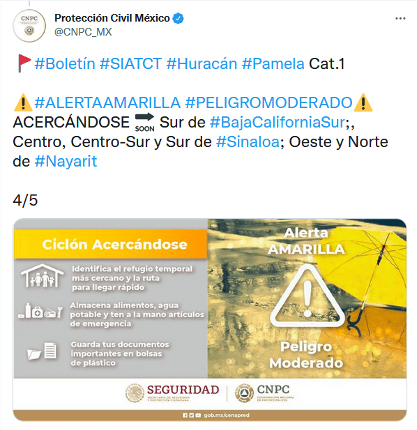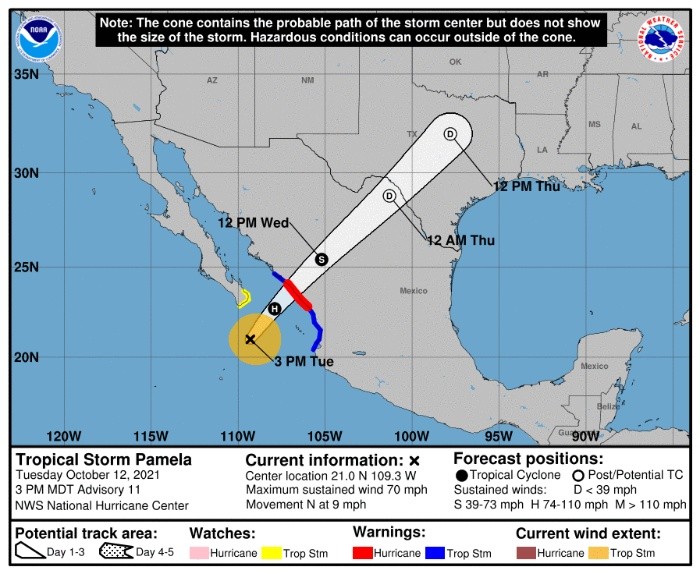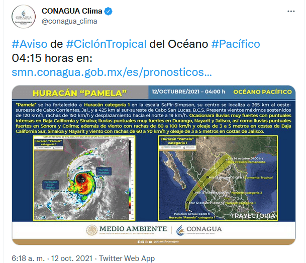 México | Huracán "Pamela" en vivo: Trayectoria y noticias al momento Estas son las actualizaciones, reportes de lluvia, inundaciones y otras afectaciones por ciclón en el Pacífico mexicano Redacción Digital . 13 de octubre de 2021 - 16:20 hs Deslaves en la autopista Durango a Mazatlán 2021-10-13 05:45La autopista Durango a Mazatlán registra deslaves que han provocado el cierre a la circulación, como un punto en el kilómetro 154, que a las 6:00 PM permanecía cerrado en ambos sentidos informó Caminos y Puentes Federales de Ingresos y Servicios Conexos (Capufe). "Le sugerimos que antes de iniciar su viaje consulte la información en nuestra línea 074. Atienda las indicaciones viales y maneje con precaución", publicó Capufe en Twitter. #Pamela ahora como tormenta tropical, golpea a #Durango. La carretera que conecta con #Mazatlán está inundada tras deslaves de un cerro contiguo y también por inundaciones. Vídeo: @mael_toto #FórmulaDurango pic.twitter.com/PthrsghHXx — Juan Pablo Pérez Díaz (@PerezDiazMX) October 13, 2021 18:45 horas Mazatlán reporta saldo blanco 2021-10-13 16:20El Ayuntamiento de Mazatlán informó que hay saldo blanco tras el paso de "Pamela" y reportó daños como inundación de algunas viviendas, caída de árboles, tendido eléctrico y estructuras. “Mazatlán está tranquilo y con saldo blanco. Las actividades económicas se irán restableciendo paulatinamente, igual el servicio de transporte”, dijo el coordinador de Protección Civil Municipal, Eloy Ruiz Gastélum. 17:20 horas "Pamela" ya es depresión tropical 2021-10-13 15:10La tormenta tropical "Pamela" se degradó esta tarde a depresión tropical sobre el norte de México, informó el Centro Nacional de Huracanes estadounidense (NHC). A las 16:00 horas, el meteoro se localizaba a 415 kilómetros al noreste de Mazatlán, con vientos máximos sostenidos de 55 km/h. Detalló que las fuertes lluvias y la amenza de inundaciones repentinas por los efectos de "Pamela" irán disminuyendo hacia esta noche sobre México. Además se espera que sus remantes lleguen e jueves a Texas y Oklahoma, en Estados Unidos. 16:10 horas Evacuan a pobladores en Durango 2021-10-13 14:10Protección Civil de Durango dio a conocer la evacuación de alrededor de 25 personas en El Salto, municipio de Pueblo Nuevo, luego de que un canal llegó a su máxima capacidad. (2) Fueron alrededor de 25 personas evacuadas y concentradas en el refugio temporal de El Salto. Continúa el monitoreo en todo el estado por el paso de la tormenta tropical "Pamela".#PrevenirEsVivir �� pic.twitter.com/uZ8HyMyDfl — PROTECCIÓN CIVIL DURANGO (@CEPCDurango) October 13, 2021 15:10 horas Prevén que se vuelva depresión tropical esta tarde 2021-10-13 13:50El SMN informó que a las 13:00 horas, "Pamela" continúa como tormenta tropical y su centro se ubicaba sobre el estado de Durango. Su localización es a 120 km al norte de la ciudad de Durango y a 270 km al noreste de Mazatlán, Sinaloa. Agregó que se descontinúa zona de prevención por efectos de tormenta tropical desde Bahía Tempehuaya hasta Escuinapa, Sinaloa. Se espera que el ciclón se debilite esta tarde a depresión tropical. 14:50 horas Restringen ingreso al mar en Puerto Vallarta 2021-10-13 12:40Protección Civil de Jalisco informó que se restringió el acceso al mar en las playas de Puerto Vallarta, debido a que el oleaje alcanza 2.5 metros de altura. 13:40 horas "Pamela" deja daños en Mazatlán 2021-10-13 12:20Daños en estructuras de comercios se observan hoy en Mazatlán, Sinaloa, por los efectos del huracán. Así quedó un bar afectado por el huracán. AP/R. Echeagaray En un área de comercios. AP/R. Echeagaray Vidrios rotos en un banco. AP/R. Echeagaray 13:20 horas Captan en videos llegada del huracán a Sinaloa 2021-10-13 11:40Usuarios de redes sociales compartieron videos de la llegada del huracán "Pamela" y los estragos que ha ocasionado en Mazatlán. En vivo SARC desde Mazatlán #HuracánPamela. pic.twitter.com/GB2omH6t4p — SARC Consultoría en Análisis de Riesgo (@sarcmx) October 13, 2021 12:40 horas "Pamela" se debilita a tormenta tropical 2021-10-13 11:00"Pamela" se debilitó a tormenta tropical sobre terriotorio mexicano, luego de tocar tierra esta mañana como huracán categoría 1 en Sinaloa, según informó el Servicio Meteorológico Nacional (SMN). A las 10:00 horas el ciclón se localizaba en tierra sobre Durango, a 140 kilómetros al nor-noreste de Mazatlán, Sinaloa, y 145 kilómetros al oeste-noroeste de la ciudad de Durango, con vientos máximos sostenidos de 100 km/h y rachas de 150 km/h. 12:00 horas Evacuan cuatro municipios de Sinaloa por paso de huracán "Pamela" 2021-10-13 07:36 Vista del municipio de Culiacán, afectado por el huracán "Pamela" y que se mantiene en alerta roja por las lluvias. AFP / R. Frías En los municipios de Elota, Escuinapa, Rosario y Mazatlán, los cuerpos de auxilio evacuaron a familias de sus hogares ante la cercanía del huracán "Pamela". Se mantiene la alerta roja en los municipios de Culiacán, Badiraguato, Cosalá, Concordia Elota, Escuinapa, San Ignacio, Rosario, Mazatlán y Navolato,. Guillermo Benítez Torres, presidente municipal de Mazatlán, dio a conocer que en la sindicatura de Villa Unión se envió albergues provisionales a cerca de 100 familias y que el arroyo de Jabalíes se desbordó por el alto volumen de agua que arrastra por lo que pidió a la ciudadanía mantenerse en sus hogares, ante la inminente entrada a tierra. La noche del martes, las autoridades del municipio de Elota dispusieron evacuar a 300 familias de ocho pequeñas comunidades susceptibles a inundaciones, las cuales fueron colocadas en los albergues provisionales donde los dotaron de comida, cobijas y colchonetas. "Pamela" toca tierra en Sinaloa como huracán categoría 1 2021-10-13 07:00 TWITTER EFE El huracán "Pamela", de categoría 1 en la escala Saffir-Simpson, tocó tierra este miércoles en el estado de Sinaloa ocasionando fu