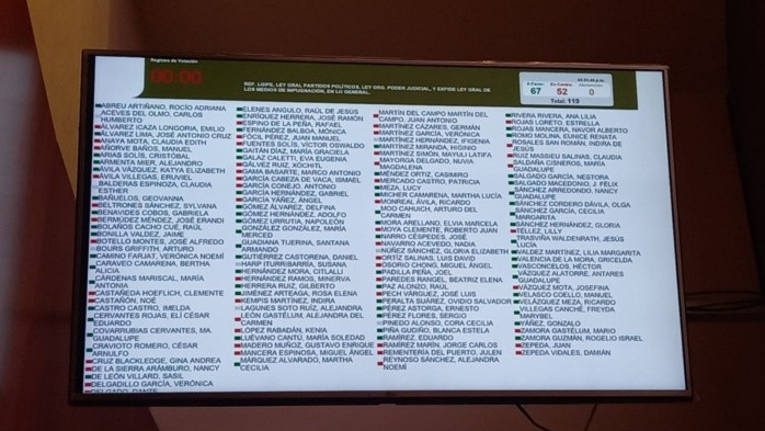 México | Sigue EN VIVO la votación del Plan B de la reforma electoral Legisladores discuten las modificaciones a la ley para reestructurar la organización, administración y ejecución de recursos de las instituciones electorales El Informador 15 de diciembre de 2022 - 23:00 hs Ahora sí queda avalado en su totalidad el Plan B de la reforma electoral 2022-12-15 23:00La Cámara de Diputados aprobó en en pleno también en lo particular el Plan B electoral de Morena y del Presidente Andrés Manuel López Obrador. Pasa al Ejecutivo para su aprobación. De las 22 reservas presentadas, pasó solo una presentada del Partido Verde Ecologista de México (PVEM) para eliminar la llamada "cláusula de vida eterna", apartado que permitía establecer la figura de candidatura común, para convenir la distribución de votos entre partidos aliados. Cámara baja aprueba también en lo general el plan B de la reforma electoral 2022-12-15 20:47Sin sorpresas. Los diputados federales aprobaron con269 a favor, 217 en contra y sin abstenciones el plan b de la reforma electoral. Diputados votan el plan B de reforma electoral 2022-12-15 20:41Diputados votan en este momento en lo general de las reformas a la Ley General de Instituciones y Procedimientos Electorales, la Ley General de Partidos Políticos, la Ley Orgánica del Poder Judicial de la Federación y expide la Ley General de los Medios de Impugnación en Materia Electoral. Cámara de Diputados reanuda la sesión 2022-12-15 18:27La Cámara de Diputados retomó la sesión donde se discute el plan B de al Reforma electoral que previamente aprobó el Senado EN VIVO El Partido Verde renuncia a su propuesta de distribución de votos 2022-12-15 18:00El coordinador del PVEM en la Cámara de Diputados, Carlos Puente, anunció que derivado de "ataques y embestidas" sobre la presunta intención de buscar la "vida eterna", determinó retirar la propuesta para que, a través de la figura de Coalición, los partidos pueden compartir votos. Diputados reciben minuta del Plan B electoral 2022-12-15 14:22El pleno de la Cámara de Diputados recibió las minutas de reforma a diversas leyes secundarias en materia electoral, mejor conocidas como el Plan B de Morena, que esta mañana fueron aprobadas en la Cámara de Senadores. PAN alista acción de inconstitucionalidad ante Corte por plan B 2022-12-15 14:20La dirigencia nacional del PAN alista la presentación de acciones de inconstitucionalidad ante la Suprema Corte de Justicia de la Nación (SCJN) por la aprobación del llamado Plan B en materia electoral. Diputados se van a receso en sesión 2022-12-15 13:14A los pocos minutos de iniciada en la Cámara de Diputados la discusión en lo general del primer paquete del Plan B se fueron a receso. Ahora diputados discuten también la reforma electoral 2022-12-15 12:52Inicia la discusión de la Reforma Electoral en la Cámara de Diputados.Analizan los cambios realizados por el Senado, como: Distribución de votos, eliminar sanciones por irregularidades en padrones de militantes y que los partidos no tengan que devolver el dinero que no gastaron SESIÓN EN VIVO López Obrador no descarta vetar reforma electoral por cláusula 2022-12-15 12:00El Presidente Andrés Manuel López Obrador señaló que no descarta vetar la reforma electoral que fue aprobada por el Senado, si es que se mantiene en la Cámara de Diputados la transferencia de votos para darles "vida eterna" a sus aliados. Dan luz verde en lo particular a la reforma en la Cámara Alta; pasa a San Lázaro 2022-12-15 07:54Con 68 votos a favor y 50 en contra y luego de una sesión y discusión maratónica, el Senado aprueba el primer paquete de la Reforma Electoral en lo particular. Ahora será devuelta a la Cámara de Diputados para su discusión y posible aprobación. Senado avala en lo particular "Plan B"; hoy se vota en Cámara de Diputados 2022-12-15 07:59El pleno del Senado de la República, con el voto a favor de Morena y sus aliados, aprobó el llamado Plan B de la reforma electoral del Presidente López Obrador, donde se revivió y avaló la llamada cláusula de vida eterna para los llamados partidos satélites del gobierno, es decir el PT, PVEM y PES, se disminuyeron las candidaturas a migrantes, indígenas y afrodescendientes, así como se compactó la estructura del INE lo que derivará en despidos masivos. Durante una maratónica sesión que se extendió por más de 20 horas se aprobó en lo general y particular el "Plan B", 68 a favor y 50 en contra el dictamen, luego de la participación de 60 oradores. SUN / D. Sánchez Senadores aprueban pasarse votos entre partidos de coalición 2022-12-14 23:00El pleno del Senado aprobó que se realicen convenios para que una coalición pueda pasar votos de un partido a otro. Los porcentajes serían acordados posteriormente. Dicha propuesta fue hecha por el Partido Verde. Al respecto, el senador Emilio Álvarez dijo que dicha propuesta "es prostitución electoral". ¿Cuáles son las 30 "b" de Lilly Téllez del Plan B de López Obrador? 2022-12-15 08:20Al presentar reservas al dictamen en la discusión del Plan B de la reforma electoral en el Senado, la senadora Lilly Téllez nombró las 30 "b" que para ella representan el plan del Presidente Andrés Manuel López Obrador. La senadora Téllez (izq) expresa: "Y a los ciudadanos de bien, con b de bien, desde esta tribuna les digo ¡ánimo! Porque a los de Morena los vamos a votar con b grande, a botar, a echar ante la justicia del país". SUN / D. Sánchez Avalan en lo general el plan B de la reforma electoral 2022-12-14 21:58Con 69 votos a favor, 53 en contra y 0 abstenciones se aprobó en lo general el pla B de la reforma electoral. Sin embargo, hay mil 242 reservas y hay anotados 60 oradores para exponer en lo particular, por lo que se prevé que sea en la madrugada cuando se avale el nuevo marco normativo. Ricardo Monreal votó en contra. En este momento votan en lo general 2022-12-14 21:53Los legisladores de la Cámara 