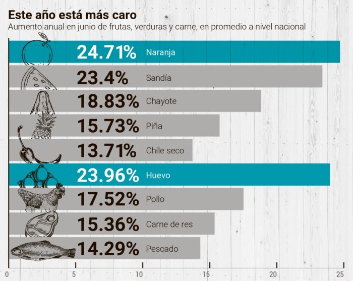 La inflación en México continuó su tendencia alcista durante junio, estimulada por el incremento de los precios en los alimentos, los energéticos y los servicios turísticos, principalmente, de acuerdo con el Instituto Nacional de Estadística y Geografía (Inegi).La inflación general anual se ubicó en 7.99%, su mayor aumento desde enero de 2001 (8.11%).Los productos con mayor incremento en los precios fueron las papas y otros tubérculos, las naranjas y el pan dulce. Conocida como el impuesto de los pobres por dañar más a quienes menos tienen, la inflación es la principal responsable de que el valor del dinero disminuya, porque se encarga de subir el precio de los bienes y servicios de manera generalizada y sostenida, lo que trae consigo una reducción del poder de compra de las familias.“En los últimos días se disparó el precio de la papa. El kilo en los supermercados subió como de 33 a casi 45 pesos en este año. Y en el mercado municipal de Atemajac ronda los 36. Debemos buscar los mejores precios para librar la semana”, menciona Carlos Hernández, vecino de El Batán. También hay incrementos en el pollo y los refrescos, así como en la electricidad, las fondas, taquerías y restaurantes, además de la gasolina Magna. Por el contrario, bajaron los precios del limón, chile, jitomate, cebolla y uva.Durante la segunda quincena de junio pasado, el índice del Paquete Contra la Inflación y la Carestía en Jalisco aumentó 13.7% respecto al mismo periodo del año anterior. De los productos que conforman el paquete, 16 de los 23 aumentaron en el Estado.A pesar de los subsidios millonarios a los combustibles, los energéticos como el gas doméstico natural, electricidad y las gasolinas también registran alzas anuales.Guadalajara registró en junio un incremento de 7.65% a tasa anual en los precios, mayor a la de mayo de 7.31%. De acuerdo con el reporte del Instituto de Información Estadística y Geográfica, IIEG, la inflación registrada en la Perla Tapatía es menor a la reportada a nivel nacional que a tasa anual fue de 7.99%, la cual se encuentra fuera del rango de 2.00% y 4.00% establecido por el Banco de México como objetivo inflacionario.La inflación fue mayor a la del mes anterior cuando se registró una tasa anual de 7.65% ligando 16 meses fuera de la banda de control del Banco de México y siendo esta cifra la segunda más alta registrada desde enero de 2001, cuando fue de 8.11 por ciento.Por ciudades, Guadalajara se posicionó en el lugar 39 entre las 55 con mayor inflación, mientras que Tepatitlán se ubicó en la posición cuatro. Cinco ciudades registraron una inflación superior al 10 por ciento.En lo que se refiere a la inflación por entidad federativa, Jalisco se encuentra en el decimonoveno lugar de las entidades con mayor incremento en los precios con 8.26% en junio, la cual es mayor a la del mes anterior de 7.77% además de ser mayor a la nacional de 7.99 por ciento.1.- Tehuantepec (Oaxaca) 10.97% 2.- Ciudad Jiménez (Chihuahua) 10.24% 3.- Fresnillo (Zacatecas) 10.22% 4.- Tepatitlán (Jalisco) 10.08 Promedio nacional 7.99% 39.- Guadalajara (Jalisco) 7:65%En la Entidad, durante la segunda quincena de junio, el índice del Paquete Contra la Inflación y la Carestía (PACIC), aumentó 13.7% respecto a la misma quincena del año anterior, ligeramente menor que la inflación PACIC nacional de 14.2% anual.Debido a que este paquete se anunció el 4 de mayo de 2022, se calcula la inflación PACIC acumulada desde la segunda quincena de abril (quincena base), observándose una variación acumulada de los precios de los productos PACIC de 3.3% en Jalisco y de 4.6% a nivel nacional desde el anuncio. De los productos que conforman el paquete, 16 de los 23 aumentaron en Jalisco con respecto a la quincena anterior, siendo la papa el producto que más subió con 11.0%, seguido de la naranja con 5.9%, mientras que el jitomate fue el que más cayó con -1.7%. A nivel nacional aumentaron 20 de los 23 productos, siendo la cebolla y la naranja los productos que sufrieron los mayores aumentos a tasa quincenal con 11.8% y 11.6%, respectivamente.NumeraliaTELÓN DE FONDOLa inflación en México continuó su tendencia al alza durante junio, con lo que ligó cinco meses con incrementos anuales, estimulada por el crecimiento de los precios en alimentos, energéticos y servicios turísticos entre otros productos, de acuerdo con los datos publicados por el Instituto Nacional de Estadística y Geografía (Inegi).En junio de 2022, el Índice Nacional de Precios al Consumidor registró una variación respecto al mes anterior, su incremento mensual más elevado para dicho mes desde junio de 1998. El incremento general de precios en el sexto mes del año se ubicó arriba del consenso de los analistas de 7.96% a tasa anual, pero dentro del rango de entre un mínimo de 7.81% y un máximo de 8.01% estimado por las 33 instituciones financieras consultadas por CitiBanamex, seis de las cuales acertaron en su pronóstico. Entre los bienes y servicios cuyos precios tuvieron mayor incidencia en la inflación vuelven a destacar los alimentos procesados y no procesados con un alza anual de 13.42%, su mayor tasa desde agosto de 1999. Sobresalen los casos de los aceites y grasas vegetales comestibles con un aumento anual de 33.26%; harinas de trigo, 28.61% y pan blanco, 24.96 por ciento.Si bien el subsidio a las gasolinas ha ayudado a contener el alza en los precios al consumidor, la inflación aún se resiste a bajar, por lo que será necesario que en la próxima reunión de política monetaria se aplique otra vez un aumento de 75 puntos para la tasa de referencia.Así lo plantearon en lo general y en lo particular, los integrantes de la junta de Gobierno del Banco de México (Banxico) quienes por primera vez mencionaron la palabra recesión como un riesgo para la economía global.De acuerdo con la Minuta número 93 de la reunión de la junta de Gobierno con motivo del anuncio de política mo