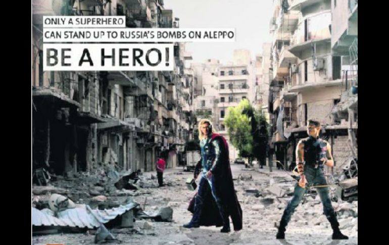 ALEPO, SIRIA (15/OCT/2016).- Aunque todos hablan de Alepo y de lo lamentable que es que cada día la ciudad siria sea bombardeada y mueran cientos de hombres, mujeres y niños, la verdad es que poco es lo que se hace para acabar con esta guerra; al menos eso de lo que sienten los habitantes de esta metrópoli donde la destrucción y la desesperanza habitan.Ante tal situación, los activistas del grupo Fuerzas Revolucionarias de Siria han lanzado una campaña a través de las redes sociales por internet empleando imágenes de los superhéroes de la película Los Vengadores para denunciar las masacres en Alepo.La organización precisa que el objetivo de la campaña “Los Vengadores en Alepo”, es “enviar un mensaje desde Siria a todo el mundo de que ‘su silencio y complacencia nos están matando y obligándonos a desplazarnos”.Los activistas lamentaron que los sirios estén muriendo por las armas químicas, barriles de explosivos, cohetes y bombas sísmicas, entre otros, “mientras que el mundo mira”.