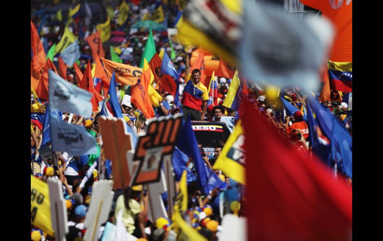 Internacional | Seguidores del candidato opositor al mandatario Hugo Chávez desbordan la calles Capriles convoca a multitudinaria marcha en Caracas La movilización se da un día después de que tres seguidores del aspirante a la presidencia fallecieran tras ser baleados en Barinas Por: EFE 30 de septiembre de 2012 - 17:57 hs CARACAS, VENEZUELA (30/SEP/2012).- Una semana antes de las elecciones presidenciales de Venezuela, la oposición exhibió hoy su capacidad de convocatoria al desbordar las calles de Caracas en respaldo a su candidato, Henrique Capriles, principal contrincante del mandatario y aspirante a la reelección, Hugo Chávez. Coloridas y bulliciosas marchas que convidaron a decenas de personas y se nutrieron a su paso con más seguidores se dirigieron desde distintos puntos de la ciudad hasta el centro capitalino, considerado bastión del chavismo, donde Capriles cerró la concentración con un discurso. Los colores de las agrupaciones opositoras, el amarillo, azul y rojo de la bandera nacional, así como imágenes de la virgen María, sombreros, réplicas de autobuses "del progreso" y la infaltable gorra que Capriles luce en cada aparición, se observaron en el recorrido. La gorra, que se convirtió en un ícono de la oposición, se vendía como pan caliente en las esquinas e incluso obligó a comerciantes a elaborar varias sobre la marcha ante el pedido de los clientes, muchos de los cuales completaban su atuendo con pintadas con el tricolor nacional en el rostro, brazos o arropados por banderas. Ataviado con la gorra tricolor y bandera en mano, David Briceño declaró, al ser consultado sobre sus razones para apoyar a Capriles, que "14 años del saliente fueron más que suficientes", en alusión al presidente Chávez. A su vez, Miriam de Garrido exhibía la fotografía de la virgen de Fátima junto al afiche del líder opositor para pedirle que proteja a los venezolanos, les dé paz, salud y que Capriles sea presidente. También Belén, una mujer de la tercera edad, mostraba junto a quienes exhibían los objetos de la campaña una imagen de la patrona de Venezuela, la virgen de Coromoto, a la cual le pidió "paz, amor y muy buena cabeza a la hora de tomar" las decisiones. Esta movilización tuvo lugar un día después de que tres seguidores de Capriles fallecieran tras ser baleados en Barinas, la ciudad natal de Chávez, hecho por el que fue detenido el atacante, según dijo a periodistas el presidente del Parlamento, Diosdado Cabello, y desmintió que éste fuera integrante del comando de campaña del oficialismo. Muchos de los que hoy se volcaron a las calles caraqueñas aseguraron que no sentían miedo por lo ocurrido en Barinas y llamaron, por el contrario, a la paz en los días que faltan. El próximo 7 de octubre, casi 19 millones de venezolanos están convocados a votar con un nuevo sistema automatizado de votaciones. Temas América Latina Venezuela Procesos electorales Lee También "Chucky" Lozano reconoce que jugaría en Chivas o en América ¿Quién ganará el partido entre las América y Chivas? Esto dice la IA José Jerí asume como presidente de Perú ¿Por qué María Corina Machado ganó el Nobel de la Paz? Recibe las últimas noticias en tu e-mail Todo lo que necesitas saber para comenzar tu día Registrarse implica aceptar los Términos y Condiciones