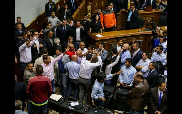 CARACAS, VENEZUELA (23/OCT/2016).- Un grupo de simpatizantes del gobierno venezolano irrumpió hoy en la sede de la Asamblea Nacional e interrumpió una sesión en la que se debatía la presunta ruptura del orden constitucional por parte del presidente Nicolás Maduro.Varias decenas de seguidores del gobierno irrumpieron en los jardines del palacio gritando consignas contra la oposición, que es mayoría en la cámara.Dentro los diputados debatían una respuesta a una decisión del Consejo Nacional Electoral (CNE) de suspender un referéndum contra Maduro, luego que varios tribunales penales admitieron denuncias del oficialismo sobre un presunto fraude con firmas reunidas en abril pasado para pedir la consulta.La irrupción en la Asamblea Nacional provocó un tumulto que paralizó la sesión cuando hablaba el primer vicepresidente de la Asamblea, Enrique Márquez.La directiva legislativa convocó la sesión para responder a la suspensión del referéndum y durante el debate denunciaron que la medida significaba una ruptura del orden constitucional.Igualmente los diputados opositores reflotando las denuncias de que Maduro tiene también la nacionalidad colombiana.El presidente de la Asamblea, Henry Ramos Allup, afirmó que estos grupos "violentos no actúan espontáneamente". Asimismo, calificó de "delictiva" la entrada de personas ajenas a la Asamblea, y exigió que fueran desalojadas del edificio."Un grupo extraño a la cámara ingresó al edificio en actitud violenta. Ya habíamos advertido que en los alrededores había gente tratando de asaltar el hemiciclo. Llamamos a que se retiren, tienen que abandonar la cámara, esta es una actitud delictiva", dijo.Algunos de los exaltados ingresaron a la cámara y ocuparon tribunas destinadas para el público, pero luego fueron expulsados por órdenes de Ramos.Los exaltados ingresaron violentamente en el edificio, gritando consignas contra la oposición y a favor del gobierno de Maduro.La puerta por donde ingresaron es usualmente es vigilada por soldados de La Guardia Nacional, que mantiene la custodia del edificio. Poco después un pelotón de soldados ingresó al edificio para restablecer el orden.En el debate el oficialismo acusó a la oposición de pretender dar un golpe de Estado contra Maduro.El líder de la bancada chavista, Héctor Rodríguez, dijo que la oposición pretendía repetir episodios golpistas perpetrados en Honduras, Paraguay y Brasil, pero advirtió que "Venezuela no es Honduras".Márquez replicó a Rodríguez diciendo que el gobierno pide más tiempo para superar la crisis "cuando no ha hecho nada" durante 2016 y la situación económica "se ha agravado". "Ellos piden más tiempo. ¿Para qué?", señaló.Antes el jefe de la bancada opositora, Julio Borges, propuso declarar la rebelión de la Asamblea Nacional tras la ruptura constitucional."En Venezuela se ha venido dando un golpe de Estado continuado y que tuvo su culminación al robarle el voto del referendo revocatorio", dijo.La oposición afirmó que Maduro había abandonado su cargo, pues está de gira por Oriente Medio y no pidió autorización a la Asamblea para salir del país.