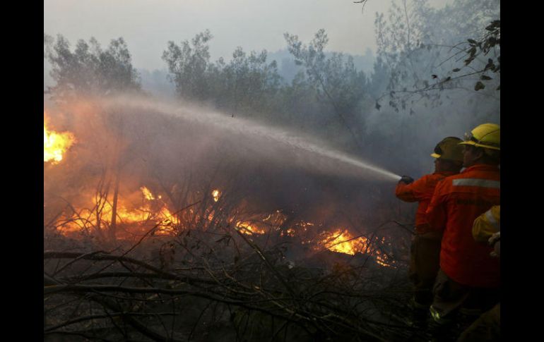 LLICO, CHILE (29/ENE/2017).- Con más de nueve mil personas y cerca de un centenar de aeronaves, Chile montó un inédito operativo de emergencia desde el viernes para combatir los peores incendios forestales de su historia, que ya arrasaron cientos de miles de héctareas.Más de cuatro mil 500 bomberos voluntarios y forestales, unos cuatro mil 600 militares, policías y funcionarios públicos, se enfrentan a los voraces incendios que ya destruyeron cerca de 480 mil hectáreas en poco más de una semana en siete de las 15 regiones del país, informó la presidenta Michelle Bachelet.“Estamos dando una batalla contra el fuego sin pausa y también sin precedentes”.Unos 24 aviones, 45 helicópteros y 124 camiones cisternas fueron movilizados por el Gobierno y empresas privadas para combatir los siniestros. Se espera además la llegada de un avión ruso con capacidad de 42 toneladas de agua para que se una a las labores de combate del fuego.Los aviones lanzan a diario alrededor de 980 mil litros de agua a los focos de incendio, según datos del Gobierno.La cifra de víctimas fatales por el siniestro se mantiene en 11, mientras que dos mil 025 personas han sido albergadas, tres mil 270 resultaron damnificadas y mil 089 viviendas fueron destruidas por estos voraces incendios.