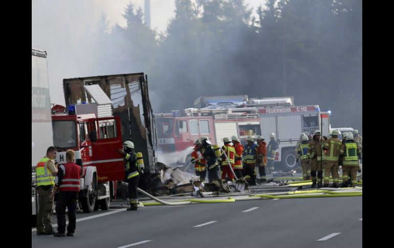 BERLÍN, ALEMANIA (03/JUL/2017).- Al menos 31 personas resultaron heridas, algunas de ellas de gravedad, después de que un autobús de pasajeros se incendiara esta mañana tras chocar contra un camión articulado en una autopista en el sur de Alemania, según informaron las fuerzas de seguridad en un comunicado.La policía trata ahora de ubicar a las otras 17 personas que viajaban en el autobús."En estos momentos no sabemos dónde se encuentra el resto de pasajeros", declaró Anne Höfer, portavoz de la policía, citada por los medios, y precisó que "del autobús ya sólo queda el chasis".El accidente se produjo en la autopista A9, a la altura de Stammbach, en el estado federado de Baviera, pasadas las siete de la mañana (05:00 GMT), cuando el autobús, en el que viajaban 46 pasajeros y dos conductores, embistió por detrás al semirremolque, que circulaba a poca velocidad debido al tráfico congestionado.La A9 ha quedado cortada al tráfico en ambas direcciones.Al lugar de los hechos se trasladaron servicios de rescate, bomberos y la policía, además de varios helicópteros.La Policía teme que los 17 desaparecidos hayan muertoLa policía teme que las 17 personas que todavía permanecen desaparecidas después de que un autobús de pasajeros se incendiara esta mañana tras chocar contra un camión articulado en el sur de Alemania no pudieran escapar de las llamas y hayan muerto en el interior del vehículo."Somos realistas y creemos que al final del día tendremos que lamentar varios muertos", declaró Jürgen Staedter, portavoz de la policía, a la cadena de noticias n-tv.El portavoz explicó que queda sólo "un hilo de esperanza" de que los desaparecidos lograran salir del autobús y se encuentren en estado de shock fuera de la zona del accidente, en el que, según el primer recuento policial, resultaron heridas al menos 31 personas, algunas de ellas de gravedad."En estos momentos no sabemos dónde se encuentra el resto de pasajeros", declaró Anne Höfer, otra portavoz de la policía citada por los medios.