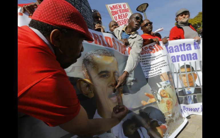 Internacional | El presidente de EU aterriza por la tarde para proseguir su gira Cientos protestan contra visita de Obama a Sudáfrica El presidente de EU aterriza por la tarde para proseguir su gira Por: EFE 28 de junio de 2013 - 10:09 hs JOHANNESBURGO, SUDÁFRICA (27/JUN/2013).- Cientos de personas de varios grupos políticos y sociales sudafricanos se manifiestan hoy en Pretoria contra la visita al país del presidente estadounidense, Barack Obama, que aterriza esta tarde en Sudáfrica. La marcha, organizada entre otros por el Partido Comunista de Sudáfrica (SACP) y la primera agrupación sindical del país, COSATU, desfiló por el centro de la capital sudafricana y gritó consignas como "No, no puedes espiarme" o "Obama, para de apoyar a dictadores en África", informa la agencia local de noticias Sapa. Los manifestantes calificaron de "primer asesino del mundo" a Obama, que llega hoy Sudáfrica procedente de Senegal y comenzará mañana su visita oficial de dos días al país austral. El grupo pasó cerca del hospital donde está internado en estado crítico el expresidente sudafricano Nelson Mandela, a quien Obama calificó ayer en Senegal de uno de sus "héroes personales". Los manifestantes, escoltados en todo momento por seis vehículos policiales, gritaron consignas de reconocimiento y ánimo a Mandela cuando estaban cerca del centro médico. Las protestas contra Obama continuarán mañana en el antiguo ghetto negro de Soweto, en el suroeste de Johannesburgo, donde el líder estadounidense participará en un acto con universitarios, esta vez encabezadas por organizaciones de estudiantes. Antes de la visita de Obama, la Asociación de Abogados Musulmanes (MLA, en sus siglas en inglés) había pedido a la fiscalía sudafricana el arresto del presidente estadounidense. La fiscalía rechazó la solicitud de los letrados islámicos, que acusaban a Obama de "genocidio" y "crímenes contra la humanidad" por su uso de aviones no tripulados para acabar con presuntos terroristas. Barack Obama se reunirá mañana con su homólogo sudafricano Jacob Zuma para después asistir en Soweto a una charla con estudiantes en el campus de la Universidad de Johannesburgo. Su agenda continuará el domingo en Ciudad del Cabo -suroeste de Sudáfrica-, donde visitará la célebre Isla de Robben, donde Mandela pasó detenido 18 años. La gira africana de Obama concluirá el 2 de julio en Tanzania. Temas África Barack Obama Manifestaciones en el mundo Nelson Mandela Sudáfrica Senegal Lee También Transportistas de la FAT anuncian bloqueo para esta fecha en CDMX Horarios y afectaciones viales por marchas de HOY en CDMX Marchas HOY CDMX: afectaciones viales, de este 20 de octubre Jugadores de LaLiga se manifiestan contra el partido en Miami Recibe las últimas noticias en tu e-mail Todo lo que necesitas saber para comenzar tu día Registrarse implica aceptar los Términos y Condiciones