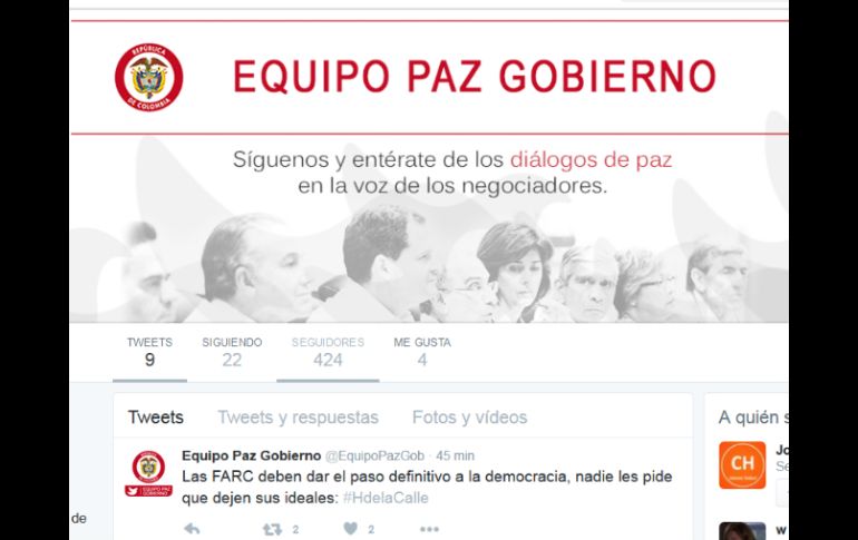 Internacional | En el sitio cada negociador compartirá reflexiones en torno a la construcción de la paz Colombia crea página web sobre diálogo con FARC En el sitio cada negociador compartirá reflexiones en torno a la construcción de la paz Por: NTX 19 de noviembre de 2015 - 17:06 hs También abrieron una página en Twitter para informar a la gente. TWITTER / @EquipoPazGob BOGOTÁ, COLOMBIA (19/NOV/2015).- El equipo negociador del gobierno colombiano abrió hoy una página web para informar sobre el proceso de paz con las Fuerzas Armadas Revolucionarias de Colombia (FARC). Humberto de la Calle, jefe del equipo, informó que la página será un mecanismo de comunicación en el que cada negociador "compartirá reflexiones en torno a la construcción de la paz". "Queremos compartir con todos los colombianos parte de nuestra experiencia en La Habana, así como poner a su disposición una herramienta más de información acerca de este proceso", agregó. El negociador gubernamental invitó a consultar la página www.equipopazgobierno.presidencia.gov.co y la cuenta de Twitter @EquipoPazGob. El gobierno y las FARC mantienen negociaciones desde noviembre de 2012 en La Habana, Cuba, para buscar una salida pacífica al conflicto armado que se vive en Colombia desde hace más de 50 años. Temas América Latina FARC Colombia Lee También ¿Empate entre Cruz Azul y América? Esto pronostica la IA ¿Dónde ver EN VIVO el partido de J13 Cruz Azul vs América? Zonas del EOU donde aún hay boletos para el Cruz Azul vs América ¿Dónde ver Argentina vs Colombia: semifinal del Mundial Sub-20? Recibe las últimas noticias en tu e-mail Todo lo que necesitas saber para comenzar tu día Registrarse implica aceptar los Términos y Condiciones