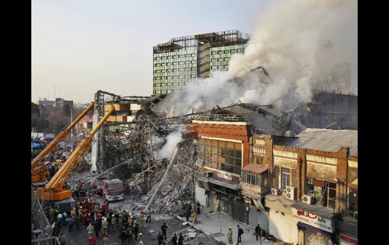TEHERÁN, IRÁN (19/ENE/2017).- El colapso de un edificio de 17 pisos en el centro de Teherán debido a un gran incendio ha dejado hasta ahora al menos 20 muertos entre los bomberos que intentaban sofocar las llamas, además decenas de heridos y más de 50 atrapados. El alcalde de Teherán, Mohamad Baqer Qalibaf, confirmó la muerte de 20 bomberos, mientras que el jefe de los servicios de emergencias reportó que unas 70 personas, en su mayoría rescatistas, resultaron heridas, de las cuales 23 han sido hospitalizadas, según la televisión iraní Press TV. El edificio más antiguo de Irán, construido hace más de 50 años y que albergaba un conocido centro comercial, se derrumbó después de un fuerte incendio que se originó en el noveno piso, afectando así a su estructura. El incendio, que provocó el derrumbe del edificio tres horas y media más tarde, estuvo causado por un cortocircuito, según las primeras investigaciones. Los equipos de rescate, que buscan entre los escombros a posibles sobrevientes, han abierto tres rutas separadas con el fin de llegar con los atrapados, según el gobernador de Teherán, Hossein Hashemi. "Desafortunadamente, después de este desgarrador incidente, entre 25 y 30 bomberos han quedado atrapados debajo de los escombros", dijo. Según la agencia iraní de noticias FARS, un bombero envió un mensaje a un colega pidiendo ayuda para rescatarlo junto a otros en la sala de máquinas del edificio. El fiscal de Teherán, Yafarí Dolat Abadí, indicó que se ha dado permiso para demoler algunos edificios colindantes con el objetivo de facilitar las labores de rescate. Asimismo, recordó que en varias ocasiones se había advertido a los propietarios del edificio siniestrado de que se encontraba en mal estado. El edificio, construido en 1962 como el primer rascacielos de Teherán, albergaba un centro comercial y talleres de confección de ropa.