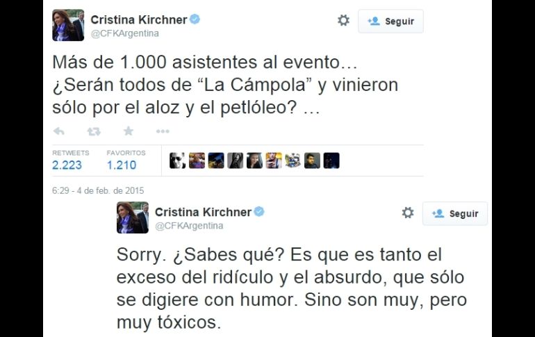 Internacional | El mensaje de la presidenta de Argentina atrae las miradas por su curiosa redacción Cristina Fernández causa polémica por tuit 'en chino' El mensaje de la presidenta de Argentina en redes sociales atrae las miradas por su curiosa redacción Por: EL INFORMADOR 4 de febrero de 2015 - 09:44 hs La mandamás argentina causa revuelo por los tuits con los que comenzó la jornada. TWITTER / @CFKArgentina GUADALAJARA, JALISCO (04/FEB/2015).- Esta mañana un tuit difundido desde la cuenta de Twitter de la presidenta de Argentina, Cristina Fernández, generó reacciones encontradas por la forma en que estaba escrito. "Más de 1.000 asistentes al evento… ¿Serán todos de “La Cámpola” y vinieron sólo por el aloz y el petlóleo?", publicó la cuenta oficial al amanecer del miércoles. Los usuarios comentaron lo que parecía ser una burla a la forma de hablar de los chinos. Se infiere que el mensaje correcto debió haber sido algo como esto: "Más de mil asistentes al seminario del Foro de Negocios entre Argentina y China, que se celebra en Beijing. ¿Serán todos de La Cámpora (la agrupación juvenil kirchnerista que suele concentrarse en las apariciones públicas de la presidenta para darle su apoyo) y vinieron sólo por el arroz y el petróleo?". Desde hoy, Cristina Fernández realiza una gira diplomática en China, donde fue recibida por el mandatario Xi Jinping en el Gran Palacio del Pueblo. Después de este episodio, un segundo mensaje de la mandataria sudamericana se difundió a través del mismo espacio: "Sorry. ¿Sabes qué? Es que es tanto el exceso del ridículo y el absurdo, que sólo se digiere con humor. Sino son muy, pero muy tóxicos". El primer tuit acumula más de dos mil repeticiones y la mitad de marcas de "Favorito" a cuatro horas de su publicación. Tras el curioso mensaje los conceptos "La Campola" y "China" se posicionaron como temas del momento entre los argentinos en Twitter. Temas América Latina Argentina Cristina Fernández Twitter Recibe las últimas noticias en tu e-mail Todo lo que necesitas saber para comenzar tu día Registrarse implica aceptar los Términos y Condiciones