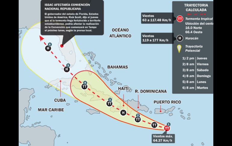 Internacional | Puede afectar la región oriental del país dentro de 48 horas Cuba anuncia primera alerta por avance de 'Isaac' Podría transformarse en huracán en las próximas horas en el sureste del Mar Caribe, y se espera que afecte la región oriental del país dentro de 48 horas Por: NTX 23 de agosto de 2012 - 21:27 hs El Estado Mayor Nacional de la Defensa Civil, reportó que 'Isaac' puede comenzar a afectar la región oriental cubana. AP / LA HABANA, CUBA (23/AGO/2012).- El gobierno de Cuba decretó hoy la "fase informativa" para las provincias del oriente de la isla ante el avance de la tormenta tropical "Isaac", que podría transformarse en huracán en las próximas horas en el sureste del Mar Caribe. El Estado Mayor Nacional de la Defensa Civil (DC), en su nota informativa número 1, dijo la noche de este jueves que "Isaac" puede comenzar a afectar la región oriental del país dentro de 48 horas. Determinó que las autoridades de las provincias de Guantánamo, Santiago de Cuba, Granma, Holguín, Las Tunas y Camagüey, deben apreciar el posible impacto de intensas lluvias por el meteoro. Recomendó considerar la situación de las presas, micropresas, canales, ríos, y la obstrucción de los sistemas de drenaje en las principales ciudades y la posible interrupción vial. También tener listos los recursos que permitan adoptar oportuna y racionalmente, si fuera necesario, las medidas de protección de las personas y los bienes económicos ubicados en áreas de alto riesgo. En su aviso de ciclón tropical número 10, el Instituto de Meteorología señaló que la tormenta "Isaac" comienza a moverse al oeste-noroeste y con poco cambio en su intensidad. Con vientos máximos sostenidos de 65 kilómetros por hora y rachas superiores, se mueve al oeste-noroeste e incrementó ligeramente su velocidad de traslación a 26 kilómetros por hora. A las 18:00 horas locales de este jueves (22:00 GMT), el centro de "Isaac" se encontraba 290 kilómetros al sur-suroeste de San Juan, Puerto Rico, y a 375 kilómetros al sudeste de Santo Domingo, República Dominicana. Temas América Latina Cuba Huracanes Lee También Melissa y Nestor, los potenciales ciclones que rodean México; ¿cuándo se forman? ¿Dónde ver EN VIVO el partido de J13 Cruz Azul vs América? Zonas del EOU donde aún hay boletos para el Cruz Azul vs América Viernes de poca lluvia para Puerto Vallarta Recibe las últimas noticias en tu e-mail Todo lo que necesitas saber para comenzar tu día Registrarse implica aceptar los Términos y Condiciones