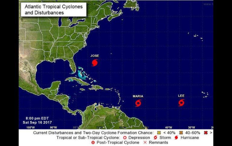 MIAMI, ESTADOS UNIDOS (16/SEP/2017).- La décimo quinta depresión tropical de la actual temporada ciclónica del Atlántico que se formó hoy al este de las Antillas Menores se fortaleció en las últimas horas y se convirtió en la tormenta tropical “María”, informó el Centro Nacional de Huracanes (CNH).“María” se desplaza con vientos máximos sostenidos de 50 millas por hora (85 kilómetros por hora) y el CNH pronostica que en el transcurso de los próximos dos días, cuando esté más cerca de las Antillas Menores, se convertirá en un huracán.En un boletín emitido a las 21:00 GMT, el centro meteorológico dio cuenta de que las islas Santa Lucía, Martinica, Guadalupe, Dominica, Barbados y San Vicente y las Granadinas está bajo alerta de tormenta tropical (paso del sistema en 48 horas), mientras que Antigua, Barbuda, Saint Kittis, Nevis y Monserrrt están bajo advertencia de huracán.Muchas de estas islas han recibido en las últimas semanas los embates de los huracanes Irma y José, con casos dramáticos como el de Barbuda, devastada en más del 90% según sus autoridades tras el paso de Irma. La tormenta, que se ubica a 620 millas (mil kilómetros) al estesureste de las Antillas Menores, se mueve con dirección oeste a una velocidad de traslación de 20 millas por hora (30 km/h) y se espera que aplique un giro rumbo al oeste-noroeste en los próximos días.Bajo ese patrón de trayectoria, los meteorólogos del CNH esperan que el sistema ciclónico se aproxime el lunes a las Antillas Menores, posiblemente con características de huracán.A partir del domingo ese conjunto de islas podría empezar a percibir los efectos de marejadas que generarían peligrosas resacas y corrientes marinas, además de fuertes lluvias un día después que dejarían hasta 12 pulgadas (304 milímetros) en partes del centro y del sur de este archipiélago.Antigua, Barbuda, Saint Kitts, Nevis y Montserrat podrían ver incluso los efectos de marejadas ciclónicas que subirán el nivel del agua hasta 5 pies (1.5 metros) por encima de lo normal.La formación de esta tormenta se suma a otros dos ciclones que se hallan en el Atlántico.Poco antes, otro sistema ciclónico con estas características se fortaleció y convirtió hoy en la tormenta tropical “Lee”, ubicada al oeste-suroeste de las islas Cabo Verde, frente a la costa nororiental africana, y sin que suponga por el momento una amenaza para zonas pobladas.“Lee”, la décimo cuarta depresión de la temporada, presenta vientos máximos sostenidos de 40 millas por hora (65 kilómetros por hora), con rachas más fuertes, y se esperan pocos cambios en su intensidad para los próximos dos días.Asimismo, el huracán de categoría 1 “José” se mantiene entre las Bahamas y las Bermudas, moviéndose con rumbo norte a 6 millas por hora (9 km/h), según el CNH, en el que pronosticó que bajo ese patrón de trayectoria "el centro de José se desplazará sobre el oeste del Océano Atlántico, entre la costa este de Estados Unidos y Bermudas, durante el lunes"El ciclón, que ha incrementado sus dimensiones, continúa con vientos máximos sostenidos de 80 millas por hora (130 km/h) y se espera que permanezca como huracán durante los próximos días.