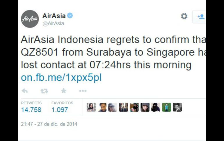Internacional | Informan que se perdió el contacto con la aeronave que llevaba 162 personas a bordo Desaparece avión de AirAsia con rumbo a Singapur Informan que se perdió el contacto con la aeronave que llevaba 162 personas a bordo Por: AP 27 de diciembre de 2014 - 21:13 hs YAKARTA, INDONESIA (27/DIC/2014).- Los controladores de vuelo perdieron contacto con un avión de AirAsia en la que viajaban 162 personas después de despegar de Indonesia con rumbo a Singapur, informaron autoridades, mientras que la aerolínea dijo que las operaciones de búsqueda y rescate ya estaban en curso. El avión perdió contacto con el aeropuerto de Surabaya, Indonesia, 42 minutos después de haber despegado a las 5:35 de la mañana del domingo, dijo Hadi Mustofa, un funcionario del Ministerio de Transporte, a la televisora indonesia MetroTV. AirAsia dijo en un comunicado que el avión era un Airbus A320-200. Mustofa dijo que en la aeronave viajaban siete tripulantes y 155 pasajeros. Agregó que se presume que el avión perdió contacto cuando volaba sobre el Mar de Java, entre las islas de Kalimantan y Java. La autoridad de aeronáutica de Singapur dijo que el control de tierra en Yakarta le informó de la desaparición del aparato casi media hora después de que se perdiera la comunicación. "Las autoridades indonesias activaron las operaciones de búsqueda y rescate", según la autoridad, que agregó que la fuerza aérea y la marina de Singapur pusieron en servicio dos aviones C-130. Temas Asia Desapariciones y caídas de aviones Indonesia Singapur Lee También Desaparecidos, la prioridad del gasto Hallan más bolsas con restos humanos en colonia Arroyo Hondo Russell sorprende y se queda con la pole en Singapur Piastri domina en un caótico arranque del GP de Singapur Recibe las últimas noticias en tu e-mail Todo lo que necesitas saber para comenzar tu día Registrarse implica aceptar los Términos y Condiciones