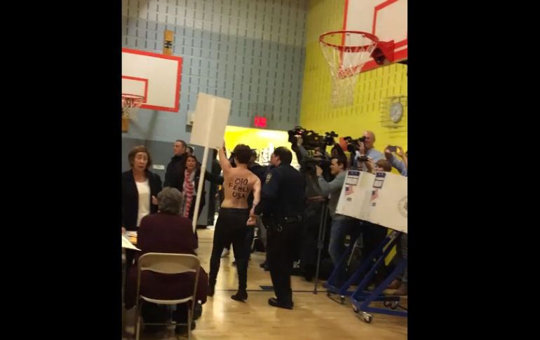 GUADALAJARA, JALISCO (08/NOV/2016) Dos mujeres miembros del movimiento Femen, han sido detenidas este martes luego de protagonizar una protesta en "topless" en contra de Donald Trump minutos antes de que el candidato republicano llegara a emitir su voto electoral.Al grito de "¡Agárrate tus pelotas, mantente fuera de mi coño!" la mujeres fueron expulsadas del colegio electoral de Donald Trump.Los gritos de la protestantes se originan luego de que el pasado 7 de octubre fuera difundido un audio por el diario The New York Times en el que Trump asegura que "si eres una celebridad (las mujeres) te dejan hacer lo que quieras" y posteriormente saliera un artículo del mismo rotativo en el que recoge testimonio de dos mujeres que acusan de abuso sexual al magnate inmobiliario.Tras la protesta, las mujeres fueron expulsadas del lugar y detenidas. Pudes ver el video AQUÍ+Sigue la cobertura especial de la Elección EU 2016