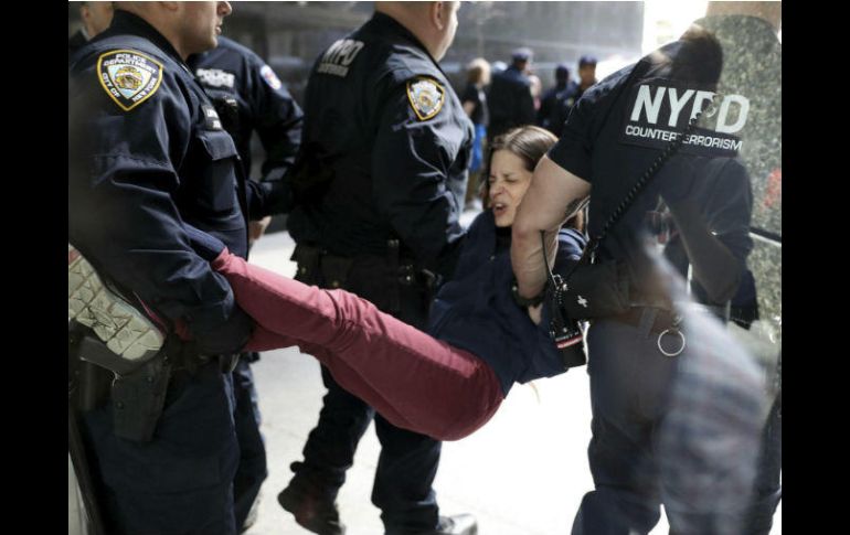 NUEVA YORK, ESTADOS UNIDOS (13/ABR/2017).- Alrededor de dos docenas de personas fueron arrestadas el jueves al interior de la Torre Trump después de realizar una protesta contra las políticas de inmigración del presidente Donald Trump.Un video publicado en Twitter muestra a una persona en el segundo nivel del vestíbulo del edificio con un letrero grande que decía "No Raids" (No a las redadas).Otro video muestra a personas sentadas en el piso de mármol cerca de los elevadores del inmueble. Los manifestantes levantan carteles con mensajes contra el veto decretado a viajeros de ciertos países musulmanes y contra el plan de construir un muro en la frontera con México.La policía de Nueva York dijo que sus oficiales arrestaron a los manifestantes después que se negaron a salir.La policía y el Servicio Secreto han reforzado la seguridad en la Torre Trump desde la elección presidencial, pero el vestíbulo sigue abierto al público.No hubo una respuesta al mensaje dejado el jueves a la Organización Trump.