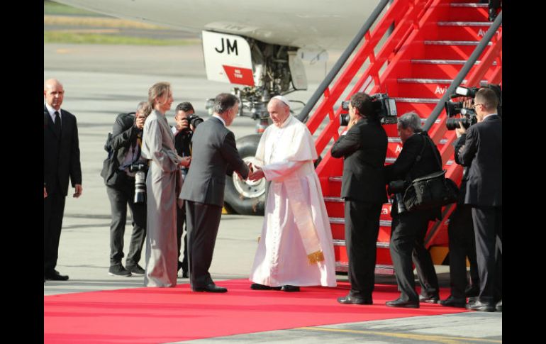 BOGOTÁ, COLOMBIA (06/SEP/2017).- El Papa Francisco arribó el miércoles a Colombia para una visita pastoral de cinco días en la que busca ayudar a sanar las heridas y reconciliar a una nación dividida tras desactivar el conflicto armado más largo de Latinoamérica.El avión de Alitalia que trajo al Pontífice argentino a suelo colombiano, aterrizó a eso de las 4:10 pm hora local en una sección militar del aeropuerto internacional El Dorado, pocos minutos antes de lo previsto por los organizadores. Se creyó que arribaría con retraso debido a que el vuelo debió cambiar de ruta debido a la presencia del letal huracán Irma sobre el Caribe.Se trata de la tercera visita de un Papa a la nación sudamericana, luego de los viajes de Pablo VI y Juan Pablo II en 1968 y 1986.Francisco había prometido visitar a Colombia después de que el país lograse desactivar un conflicto de medio siglo con las Fuerzas Armadas revolucionarias de Colombia (FARC), que costó la vida a más de 220 mil personas y desarraigó a miles.