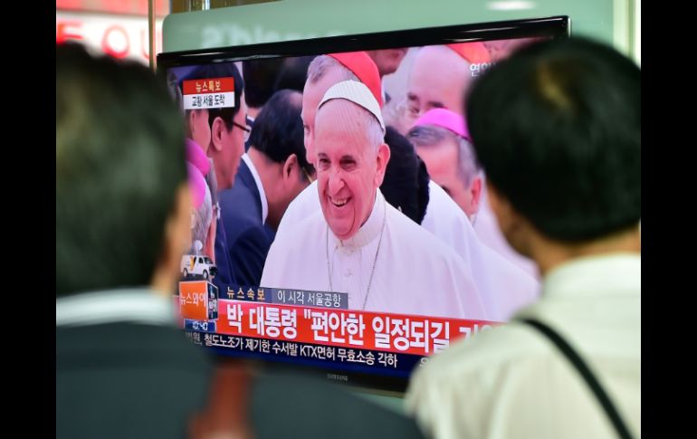 Internacional | El Pontífice santificará a 124 mártires coreanos El Papa Francisco llega a Corea del Sur El Pontífice santificará a 124 mártires coreanos y participará en un festival católico juvenil Por: AP 13 de agosto de 2014 - 20:26 hs Coreanos ven por televisión la llegada del Papa Francisco a Seúl. AFP / SEÚL,COREA DEL SUR (13/AGO/2014).- El Papa Francisco llegó a Corea del Sur en una visita para santificar a 124 mártires coreanos y alentar a los fieles en una iglesia considerada el modelo del catolicismo a futuro. El avión del pontífice aterrizó el jueves en la primera visita papal a Corea del Sur en un cuarto de siglo. La presidenta Park Geun-hye y otros funcionarios esperaron junto a una alfombra roja para saludar al papa. Uno de los puntos destacados de la visita de cinco días de Francisco a Corea del Sur será su participación en un festival católico juvenil. También celebrará una misa por la paz en la dividida península de Corea. Se espera que el Pontífice ser reúna con familiares de las víctimas de un ferry que se hundió hace poco. Temas Asia Corea del Sur Papa Francisco Recibe las últimas noticias en tu e-mail Todo lo que necesitas saber para comenzar tu día Registrarse implica aceptar los Términos y Condiciones