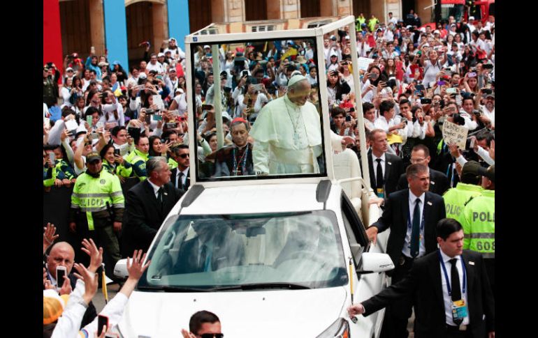 BOGOTÁ, COLOMBIA (07/SEP/2017).- El Papa Francisco partió hoy en automóvil de la Nunciatura Apostólica de Bogotá en dirección al parque Simón Bolívar de la capital colombiana, en donde esta tarde oficiará su primera misa campal en el país.Al igual que lo sucedido esta mañana cuando se dirigió a la Casa de Nariño, sede del Ejecutivo colombiano, Francisco bajó el vidrio de la ventanilla para saludar a miembros del equipo de seguridad y a fieles congregados a las puertas de la Nunciatura Apostólica que nuevamente le acercaron niños para que los bendijera.Previamente el obispo de Roma se reunió en la Nunciatura con el Comité Directivo del Consejo Episcopal Latinoamericano (Celam), cita a la que asistieron 62 prelados.En el Parque Simón Bolívar esperan al papa desde esta madrugada al menos unas 600 mil personas que han soportado sol y lluvia sin perder el entusiasmo.