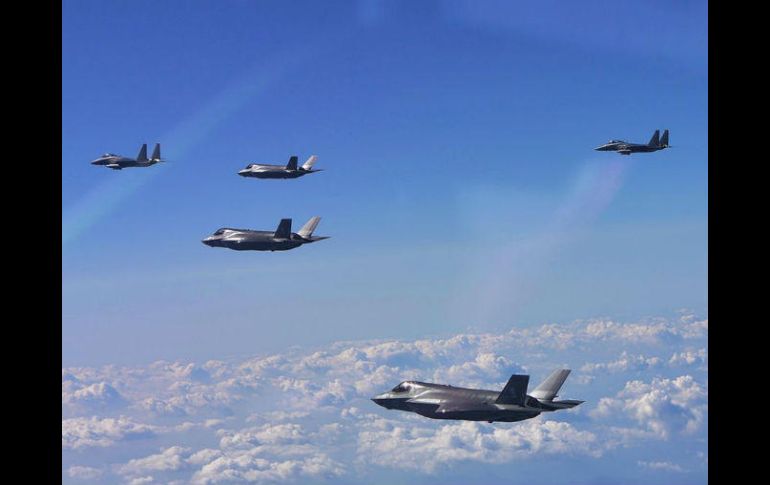 SEÚL, COREA DEL SUR (18/SEP/2017).- Cuatro cazas F-35B y dos bombarderos estratégicos B-1B estadounidenses realizaron hoy un simulacro de bombardeo sobre la península de Corea en respuesta al lanzamiento de un misil de alcance medio realizado el pasado viernes por el régimen de Pyongyang.En las maniobras participaron también cuatro cazas surcoreanos F-15K, según adelantó una fuente del Gobierno de Seúl a la agencia Yonhap.Los ejercicios se efectúan tres días después de que Corea del Norte lanzara un misil de alcance intermedio que recorrió unos tres mil 700 kilómetros y sobrevoló el norte del archipiélago japonés antes de caer al mar, en lo que supuso el primer proyectil que ha disparado tras realizar su sexta prueba nuclear el pasado 3 de septiembre.El despliegue de estos activos militares como prueba de fuerza empieza a ser habitual por parte de Estados Unidos, que el pasado 31 de agosto ya envió a la península precisamente cuatro cazas furtivos F-35B y dos bombarderos B-1B en respuesta al lanzamiento de otro misil balístico por parte de Pyongyang.