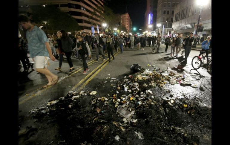 LOS ÁNGELES, ESTADOS UNIDOS (09/NOV/2016).- Varias protestas estallaron el miércoles en Estados Unidos tras anunciarse que Donald Trump ganó las elecciones presidenciales.Hubo incidentes de Pennsylvania a California, Oregón y Washington. Cientos de personas salieron a las calles para expresar su oposición a la victoria de Trump sobre la demócrata Hillary Clinton.La policía dijo que unas 500 salieron a las calles al lado de la Universidad de California en Los Angeles, algunos gritando groserías contra Trump y otros exclamado "¡Ese no es mi presidente!".No hubo arrestos de inmediato.Hubo manifestaciones más pequeñas en la zona y en los vecindarios de Berkeley, Irvine and Davis y en San Jose State.En Oakland, más de 100 personas salieron a protestar. El canal KNTV-TV reportó que los manifestantes quemaron una efigie de Trump, rompieron ventanas de las oficinas del diario Oakland Tribune y prendieron fuego a neumáticos y pilas de basura.La Patrulla de Carreteras de California informó que una mujer fue atropellada por un vehículo y resultó herida de gravedad.En Oregón, docenas de personas bloquearon el tránsito en el centro de Portland y causaron retrasos en los trenes. Versiones de prensa dijeron que multitud llegó a abarcar unas 300 personas, entre ellas algunas que se sentaron en medio de la calle para impedir el tránsito. Los manifestantes quemaron banderas estadounidenses y gritaron "¡Ése no es mi presidente!"En Seattle, unas 100 salieron a protestar en el vecindario Capital Hill, trancando el tránsito y prendiéndole fuego a una pila de basura.En Pennsylvania, cientos de estudiantes de la Universidad de Pittsburgh marcharon por las calles. El diario estudiantil the Pitt News anunció una "reunión de emergencia para hablar de cómo podemos detener al presidente Trump".+Sigue la cobertura especial con resultados a detalle