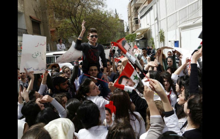 DAMASCO, SIRIA (11/ABR/2017).- Cientos de estudiantes sirios se concentraron este martes ante la sede de la delegación de Naciones Unidas en Damasco para protestar contra los bombardeos estadounidenses de la semana pasada contra una base aérea del ejército, constató un periodista de la AFP."Trump apoya el terrorismo", rezaban las pancartas que portaban los manifestantes, que también agitaban la bandera siria y retratos del presidente Bashar Al Asad.Estados Unidos bombardeó el viernes, con 59 misiles "Tomahawk" la base de Al Shayrat, en la provincia central de Homs, en respuesta a un presunto ataque químico ocurrido dos días antes en Jan Sheijun que dejó 87 muertos y que fue imputado al régimen sirio.El gobierno sirio negó haber utilizado sustancias químicas, afirmando que bombardeó un "almacén" de los yihadistas que contenía "sustancias tóxicas", y calificó el ataque estadounidense de "acto idiota e irresponsable"."Estamos aquí para denunciar los bombardeos estadounidenses", afirmó Ayyad Talab, presidente de la rama universitaria de la Unión Nacional de Estudiantes Sirios (UNES), que organizó la manifestación."Queremos demostrar que estamos dispuestos a defender nuestro país", indicó a la AFP."La agresión estadounidense (...) es una vergüenza para la democracia que reivindica Estados Unidos", subrayó por su parte Mahmud Issa.La UNES escribió una carta al secretario general de la ONU, Antonio Guterres, que la misión de la ONU en Damasco prometió entregarle.El bombardeo estadounidense contra el régimen es el primero desde que comenzara la guerra, en marzo de 2011. El conflicto ya ha dejado más de 320 mil muertos y ha forzado a millones de personas a abandonar sus hogares.