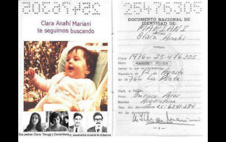 Internacional | Abuelas de Plaza de Mayo sostienen que aún hay unas 400 personas desaparecidas Ex titular de Abuelas de Plaza de Mayo se reencuentra con su nieta Abuelas de Plaza de Mayo sostienen que aún hay unas 400 personas desaparecidas durante la dictadura Por: EFE 24 de diciembre de 2015 - 13:32 hs La identidad es confirmada por análisis de ADN, que reflejó una compatibilidad entre nieta y abuela del 99.9 por ciento. FACEBOOK / Maria Isabel Chorobik BUENOS AIRES, ARGENTINA (24/DIC/2015).- Tras buscarla durante 39 años, la abuela de Plaza de Mayo María Isabel Chorobik de Mariani se reencontró con su nieta Clara Anahí Teruggi, apropiada durante la última dictadura (1976-1983). A través de un comunicado difundido en las redes sociales, Chorobik de Mariani, fundadora y ex presidenta de la agrupación Abuelas de Plaza de Mayo, quiso compartir "la inmensa alegría" por el anhelado reencuentro con su nieta a sus 91 años de edad. La identidad fue confirmada por análisis de ADN, que reflejó una compatibilidad entre nieta y abuela del 99.9 por ciento. Clara Anahí Teruggi es la 120 que conoce su verdadero origen. La Fundación Anahí, fundada por Chorobik de Mariani en 1996 en La Plata, brindará más detalles el próximo lunes en una rueda de prensa en La Plata. Abuelas de Plaza de Mayo sostiene que aún hay unas 400 personas que fueron apropiadas durante la dictadura. Temas América Latina Argentina Desapariciones y denuncias Lee También México vs Argentina: Estas son las posibles alineaciones para el Mundial Sub-20 Jalisco reporta una tendencia a la baja en desapariciones México busca frenar el paso perfecto de Argentina en Mundial Sub-20 La historia de Belinda y Lupillo a través de los años Recibe las últimas noticias en tu e-mail Todo lo que necesitas saber para comenzar tu día Registrarse implica aceptar los Términos y Condiciones