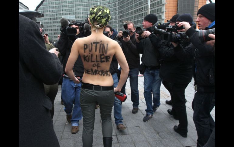 Internacional | Llaman asesino al presidente de Rusia, reclaman libertad de presos políticos Femen protesta en Bruselas por la visita de Putin Llaman asesino al presidente de Rusia, reclaman libertad de presos políticos Por: AFP 28 de enero de 2014 - 10:56 hs BRUSELAS, BÉLGICA (28/ENE/2014).- Dos activistas del movimiento feminista Femen protestaron hoy ante la sede del Consejo Europeo en Bruselas con motivo de la visita oficial que realiza el presidente de Rusia, Vladimir Putin, a la capital europea. Putin participará junto a los presidentes de la Comisión, José Manuel Durao Barroso, y el Consejo Europeos, Herman Van Rompuy, en una cumbre bilateral, en la que analizarán entre otros asuntos la situación de los derechos humanos, así como la evolución de los conflictos en Ucrania o Siria, entre otros. Las dos activistas gritaron consignas contra el Gobierno de Putin, al que calificaron de "asesino" y reclamaron la "libertad de los presos políticos" en aquel país. Las activistas fueron rápidamente inmovilizadas por la seguridad del Consejo antes de ser detenidas por la Policía belga. Durante la protesta, que duró unos minutos, ambas mujeres estuvieron con el torso desnudo y escribieron mensajes contrarios al presidente ruso. Temas Europa Rusia Manifestaciones en el mundo Vladimir Putin Bélgica Lee También ¿Trump merecía el Nobel de la Paz? Esto respondió Putin Sociales: El Informador inicia una nueva etapa con la moderna imprenta "Doña Stella" Lo peor es que Claudia también tiene sus dudas Sobrevivientes de tortura inician huelga de hambre Recibe las últimas noticias en tu e-mail Todo lo que necesitas saber para comenzar tu día Registrarse implica aceptar los Términos y Condiciones