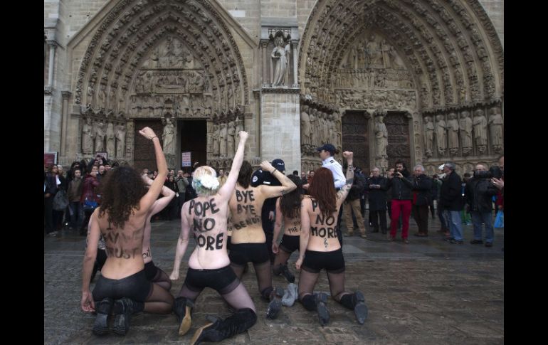 Internacional | Este grupo de feministas son conocidas desde 2010 por sus acciones Feministas en ''topless'' festejan en Notre Dame la partida del Papa Las feministas repicaron las campanas con pedazos de madera, al tiempo que gritaban en inglés ''Pope no more'' (''No más Papa'') Por: AFP 12 de febrero de 2013 - 10:48 hs Las feministras gritaron consignas como ''No más Papa'', ''No homofobia'', ''Crisis de la fe'' y ''Bye bye Benedicto!''. AFP / PARÍS, FRANCIA (12/FEB/2013).- Ocho feministas con los senos desnudos manifestaron el martes en la catedral de Notre Dame de París para "festejar la partida del papa" Benedicto XVI, comprobó un periodista de la AFP. Las mujeres, que entraron en medio de decenas de turistas, vestían largos abrigos, que se quitaron cerca de tres de las nueve campanas colocadas de manera provisional en la gran nave de la catedral. Las feministas repicaron las campanas con pedazos de madera, al tiempo que gritaban en inglés "Pope no more" ("No más Papa"). En los pechos y en la espalda, habían escrito con plumón consignas como "No homofobia", "Crisis de la fe" y "Bye bye Benedicto!". Visitantes de la catedral expresaron su consternación. La catedral "es sagrada, ustedes no deben desnudarse aquí", les dijo una turista francesa. Las mujeres fueron evacuadas 'manu militari' del edificio por el servicio de orden de Notre Dame, y permanecieron una decena de minutos frente a la catedral, lanzando consignas. Este grupo de feministas son conocidas desde 2010 por sus acciones "topless" (senos al aire) en Rusia, Ucrania y el Reino Unido. Recientemente se manifestaron en la plaza San Pedro de Roma, mientras el papa recitaba el Angelus. Temas Europa Francia Papa Benedicto Manifestaciones en el mundo Sucesión papal Lee También Macron tiene nuevo gabinete y enfrenta un complicado reto Sociales: El Informador inicia una nueva etapa con la moderna imprenta "Doña Stella" Dr. Simi llega al Vaticano; le entregan peluche al Papa León XIV Lo peor es que Claudia también tiene sus dudas Recibe las últimas noticias en tu e-mail Todo lo que necesitas saber para comenzar tu día Registrarse implica aceptar los Términos y Condiciones