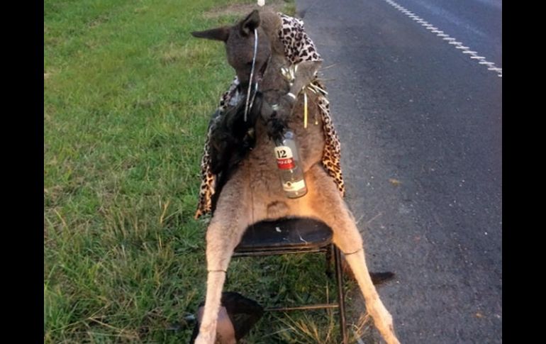 SÍDNEY, AUSTRALIA (28/JUN/2017).- El hallazgo del cadáver de un canguro abatido a balazos, cubierto por una tela con estampado de leopardo y atado a una silla con una botella de alcohol entre las patas ha escandalizado a Australia.El canguro fue encontrado en el arcén de una carretera del noreste de Melbourne por alguien que pasaba por allí, explicó el miércoles un investigador del departamento de Medioambiente del estado de Victoria.El animal, que llevaba algo parecido a un chal estampado a la espalda, tenía entre sus patas, atadas, una botella de uzo."El canguro había recibido, al menos, tres balazos, antes de que lo pusieran sobre la silla", declaró Mike Sverns. "Se trata de un comportamiento lamentable e inmoral".Sverns lanzó un llamado a testigos y recordó que matar a animales salvajes protegidos podía conllevar una multa de hasta 36 mil 500 dólares australianos (27 mil euros) y una pena de cárcel de dos años."Se necesitó tiempo para poner al canguro así, al lado de la carretera, y estamos seguros de que alguien debió haber visto algo, dado el lugar y la circulación", afirmó.Las autoridades creen que el canguro no fue abatido en el lugar donde fue encontrado.