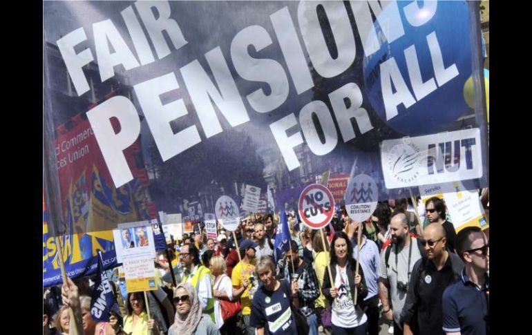 Internacional | Se espera que alrededor de 750 mil empleados participen en el paro de un día Inicia en Gran Bretaña paro general contra planes de austeridad Maestros y empleados del gobierno protestan contra los recortes en las pensiones Por: AP 30 de junio de 2011 - 10:55 hs Da inicio el paro general en Gran Bretaña contra el plan de austeridad. EFE / LONDRES, INGLATERRA (30/JUN/2011).- Maestros y empleados del gobierno iniciaron el jueves un paro general en Gran Bretaña para protestar contra los recortes en las pensiones. Se esperan interrupciones del servicio en aeropuertos, donde los viajeros podrían enfrentar largas filas en inmigración porque los oficiales que revisan los pasaportes dejarán de laborar. Se calcula que unos 750 mil empleados participarán en el paro de un día y es el primer ensayo de lo que los sindicatos esperan sea un verano de descontento contra los planes de austeridad del gobierno. El alcalde de Londres Boris Johnson repitió su llamado para cambiar una ley laboral que podría dificultar la realización de huelgas. El gobernante le dijo a la cadena BBC que las huelgas se llevan a cabo a pesar de que hay "muy poca" convocatoria a la hora de votar por las mismas. Temas Europa Manifestaciones en el mundo Gran Bretaña Recibe las últimas noticias en tu e-mail Todo lo que necesitas saber para comenzar tu día Registrarse implica aceptar los Términos y Condiciones
