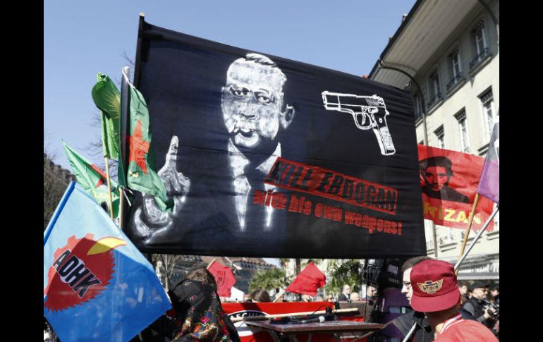 ESTAMBUL, TURQUÍA (27/MAR/2017).- La Fiscalía de Estambul ha iniciado hoy una investigación contra los manifestantes que mostraron una pancarta en la que se incitaba a matar al presidente turco, Recep Tayyip Erdogan, durante una protesta el pasado sábado en Berna, la capital de Suiza. La pancarta, que mostraba una foto de Erdogan y una pistola apuntándole junto al mensaje "Mata a Erdogan con sus propias armas" escrito en inglés, fue exhibida durante una protesta contra la reforma constitucional para dar al presidente turco el poder legislativo.La Fiscalía investiga a los asistentes en esa manifestación por "insultar al presidente" y por pertenecer y hacer propaganda "de una organización terrorista", en referencia al proscrito Partido de los Trabajadores del Kurdistán (PKK), considerado terrorista en Turquía y la Unión Europea.La Fiscalía de la capital suiza también ha iniciado una investigación porque algunos manifestantes presuntamente incumplieron algunas condiciones del permiso de protesta, informó la agencia turca Anadolu.El pasado sábado, el Ministerio de Exteriores turco convocó al embajador suizo en Ankara para expresar su malestar por lo ocurrido.