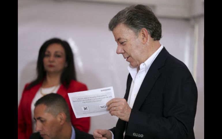 BOGOTÁ, COLOMBIA (02/SEP/2016).- El presidente Juan Manuel Santos vota en la Plaza Bolivar en el centro de la capital colombiana. El mandatario llegó acompañado por su esposa y sus hijos."Acabo de depositar mi voto en este plebiscito. En esta votación histórica que espero cambie la historia de este país para bien. Terminar una guerra de 52 años, el camino de la paz", dijo el gobernante ante los periodistas que se agolpaban en el lugar para ver al gobernante, la cabeza visible de la campaña por el "sí" a los acuerdos que sus representantes negociaron en Cuba con las FARC."La paz nos va a llevar a un mejor futuro", agregó Santos quien destacó la coincidencia de que en un día como nació Mahatma Gandhi, uno de los más grandes líderes de la no violencia.A las 08:00 horas locales, luego de las notas del himno nacional se abrieron las urnas en toda Colombia para el plebiscito que deberá avalar o no los acuerdos firmados entre el gobierno y las Fuerzas Armadas Revolucionarios de Colombia (FARC).Una jornada lluviosa en casi todo el país bajo los efectos del huracán Matthew marcó el inicio de las votaciones en las cuales están habilitados casi 34 millones de ciudadanos.Filas de personas se daban cita en los puestos electorales de Bogotá, la capital desafinado además el frio.