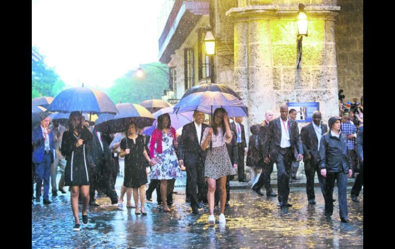 Internacional | Política. Cierran su primer día en la isla con una cena familiar Los Obama pasean por La Habana Vieja Debido a la fuerte lluvia, su encuentro con personal diplomático no fue al aire libre Por: EL INFORMADOR 21 de marzo de 2016 - 00:22 hs LA HABANA, CUBA (21/MAR/2016).- Con un paseo y una cena familiar en La Habana Vieja, el presidente de Estados Unidos, Barack Obama, cerró su primer día en Cuba, donde recibió un cálido recibimiento por parte de los ciudadanos que salieron a la calle deseosos de verle pese a la fuerte lluvia que cayó ayer en la capital del país. Debido al mal tiempo, la ceremonia de encuentro de Obama con el personal diplomático estadounidense en Cuba y sus familias no se celebró en la Embajada de Estados Unidos al aire libre, como estaba previsto, sino en un salón del hotel Meliá Habana. El paseo comenzó en la Plaza de Armas, donde la familia Obama estuvo contemplando la estatua de Carlos Manuel de Céspedes, uno de los líderes independentistas de la Isla. Luego se dirigieron al Palacio de los Capitanes Generales, que fue el edificio del antiguo Gobierno colonial y que ahora alberga el Museo de la Ciudad. Bajo una intensa lluvia y protegidos por paraguas, la familia presidencial llegó a la Plaza de la Catedral, donde Barack se detuvo brevemente a saludar a algunos de los ciudadanos que les esperaban en los edificios aledaños mientras su esposa, Michelle, caminaba agarrada del brazo de su madre, Marian Robinson. Dentro de la catedral fueron recibidos en privado por el cardenal cubano y arzobispo de La Habana, Jaime Ortega. Después, la comitiva presidencial se introdujo por las estrechas calles de Habana Vieja y Centro Habana, donde cientos de vecinos hicieron fotos desde balcones y puertas, y les recibieron con aplausos y vítores. Para cerrar el día, la familia presidencial escogió cenar en privado en el restaurante privado “San Cristóbal”, ubicado en Centro Habana. Poco antes de las nueve de la noche hora local, cuando los Obama se marcharon de Centro Habana, cientos de vecinos seguían en las calles para tratar de presenciar, aunque fuera de lejos, los coches y autobuses de la comitiva presidencial. La familia pasó la noche en la residencia del embajador estadounidense en Cuba y para hoy el mandatario estadounidense tendrá una agenda repleta, que incluirá un encuentro con el mandatario cubano, Raúl Castro, y la participación en un foro con empresarios estadounidenses y emprendedores de la Isla. Obama es el primer presidente norteamericano en ejercicio que visita Cuba en casi 90 años. Al pasear por las calles, se le vio relajado y sonriente, y los cubanos mostraron entusiasmo por la visita. DAMAS DE BLANCODispersan a manifestantes A pocas horas de la llegada del presidente Barack Obama a La Habana, decenas de activistas que protestaban encabezados por las Damas de Blanco, fueron detenidos y arrastrados hacia autobuses por agentes del Estado. Los inconformes se concentraron en el Parque Mahatma Gandhi de la Quinta, contiguo a la iglesia de Santa Rita, para repudiar al Gobierno comunista antes de asistir a misa y marchar en silencio. Su acto estuvo cargado de críticas al presidente de Estados Unidos por su supuesta condescendencia con el Gobierno de Raúl Castro. “Obama ha llegado en un momento en que no debiera haber venido”, dijo la líder de la agrupación, Berta Soler. Dirigiéndose al presidente, agregó: “usted expresó que vendría si había avances en derechos humanos, y eso no ha pasado”. El mandatario estadounidense prometió que trataría directamente con Castro los “obstáculos” a los derechos humanos en la Isla, según una carta dirigida hace ocho días a las Damas de Blanco, una organización considerada ilegal en Cuba que surgió de la iniciativa de esposas de presos políticos. Por la noche, algunos de los 60 opositores detenidos comenzaron a ser liberados, entre ellos figuran Soler y su esposo. Soler explicó a los medios de comunicación que desconocía el número de liberados. Según la disidente, algunas de sus compañeras le han explicado que quedaron en libertad pero vigiladas en el entorno de sus casas para impedirles salir. ¿QUÉ HARÁ BARACK HOY?• LUNESBienvenida Esta mañana el presidente estadounidense inicia formalmente su visita de Estado a Cuba, con una ofrenda floral en el memorial de José Martí. Ahí será objeto de una recepción de Estado en el Palacio Revolucionario por el mandatario cubano Raúl Castro. Diálogo Luego del protocolo de recepción, Barack Obama y Raúl Castro sostendrán una reunión a puerta cerrada en el Palacio Revolucionario, ahí analizarán los temas pendientes en el proceso de normalización de relaciones diplomáticas entre ambas naciones. Encuentro Por la tarde de hoy Obama se reunirá con un grupo de emprendedores cubanos en la fábrica de arte, donde acentuará la importancia del desarrollo del sector privado en la isla. Por la noche será invitado a una cena de Estado con el presidente Castro como anfitrión. • MARTESMensaje Mañana temprano, desde el Gran Teatro Alicia Alonso de La Habana, Barack Obama dirigirá un mensaje al pueblo cubano. Se prevé que este sea transmitido a través de la televisión nacional de la isla. Sociedad El presidente estadounidense tiene programado un encuentro sin precedentes con miembros de la sociedad civil cubana. Se trata de un grupo seleccionado por la Casa Blanca con el que Obama discutirá la situación de derechos humanos y libertades sociales en la isla. Partido Durante la última parte del viaje Obama participará, junto con su homónimo cubano, Raúl Castro, en un juego de béisbol de exhibición. El encuentro será entre la Selección Nacional de Cuba y el equipo profesional estadounidense las Mantarrayas de Tampa Bay. ¿QUIÉNES ASISTIERON?Negocios y política La comitiva que acompaña al presidente de Estados Unidos en su viaje a Cuba la integran unos 40 congresistas, como la líder de la minoría de