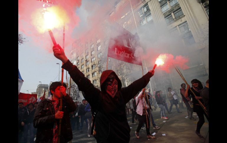 Internacional | Los manifestantes centraron su reclamo en rechazar un pacto del gobierno con opositores Marchan 80 mil estudiantes chilenos para exigir reforma educativa Con gritos y pancartas, los manifestantes centraron su reclamo en el rechazo a un pacto del gobierno con la oposición Por: NTX 21 de agosto de 2014 - 17:41 hs Un manifestante sostiene un par de bengalas. AP / SANTIAGO DE CHILE (21/AGO/2014).- Miles de estudiantes marcharon hoy por el centro de la capital chilena para exigir mejoras al sistema educativo, en una movilización que finalizó con enfrentamientos aislados entre manifestantes y la fuerza pública. Según estimaciones de la Confederación de Estudiantes de Chile (Confech), unos 80 mil alumnos de la enseñanza secundaria y universitaria participaron de la marcha por la Alameda Bernardo O'Higgins, la principal avenida del centro de Santiago. Con gritos y pancartas, los manifestantes centraron su reclamo en el rechazo a un pacto del gobierno de la presidenta Michelle Bachelet con la oposición de derecha en torno a la reforma educativa que se debate en el Congreso. "Los cambios los hacen los pueblos y no los gobiernos", "A mí no me preguntaron", "Queremos demostrar que somos muchos más los que queremos cambios en la educación", rezaban algunos de los lienzos y pancartas que portaban los jóvenes. La movilización fue autorizada por la Intendencia de Santiago, que también facultó a los dirigentes para utilizar la calzada sur de la Alameda. Por este motivo, la militarizada Policía de Carabineros debió implementar un esquema especial de seguridad, en el que participaron unos 300 efectivos, y que contempló el desvío del tránsito por esa importante arteria capitalina. Aunque la marcha se desarrolló de manera pacífica e incluso pasó frente al presidencial Palacio de La Moneda, al final se reportaron incidentes por cuenta de grupos de manifestantes encapuchados que se enfrentaron a la policía. Debido a los desórdenes, pasadas las 14:00 horas locales (18:00 GMT) se restableció el tránsito vehicular por la Alameda, una vez que Carabineros logró tomar el control de la avenida y dispersar a los manifestantes. Temas América Latina Chile Manifestaciones en el mundo Michelle Bachelet Recibe las últimas noticias en tu e-mail Todo lo que necesitas saber para comenzar tu día Registrarse implica aceptar los Términos y Condiciones