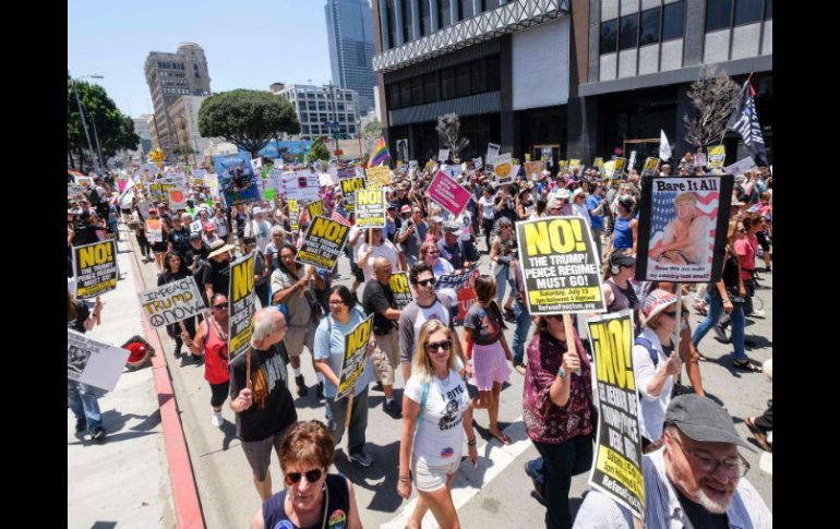 LOS ÁNGELES, ESTADOS UNIDOS (02/JUL/2017).- Miles de personas participaron hoy en marchas y concentraciones convocadas en 46 diferentes ciudades de Estados Unidos para pedir al Congreso que inicie el proceso de destitución contra el presidente, Donald Trump.Las marchas, convocadas por activistas de derechos humanos, sirvieron además de oportunidad para protestar contra las medidas de Trump en materia migratoria, sus negocios en el extranjero, la posible injerencia rusa en los comicios presidenciales de 2016 y la supuesta obstrucción a la investigación de este caso, entre otros."La obstrucción a la justicia y el haber violado la 'cláusula de emolumentos extranjeros' son ambas razones constitucionales para que el Congreso investigue y destituya al presidente", declaró Tudor Popescu, del grupo Indivisible CA D-39, principal organizador de la manifestación en Los Ángeles.La de esta ciudad californiana fue la más numerosa de las convocadas hoy en Estados Unidos, con cerca de 10 mil participantes, según Indivisible CA D-39.Sin embargo, la gran mayoría de las otras 46 marchas tuvo una concurrencia escasa.Una de ellas fue la de Nueva York, donde apenas varias decenas de personas protestaron frente al Trump International Hotel, a donde también acudió un grupo que mostró su respaldo al presidente, sin que se produjera ningún incidente."Manos muy pequeñas no pueden construir el muro" de la frontera de México, cantaron los manifestantes en Nueva York, donde un hombre disfrazado del presidente ruso, Vladimir Putin, aparecía a hombros de Trump y portaba un letrero en el que se leía "No nexos con Rusia. Créanme".Si en Nueva York los protestantes acudieron al Trump International Hotel, en Palm Beach (Florida) una marcha concluirá frente al club Mar-a-Lago, propiedad del presidente y donde el mandatario pasó buena parte de sus días libres el pasado invierno."Hoy marchamos en solidaridad con otras ciudades de EU para afirmar que queremos legisladores que den prioridad a las personas y basados en la evidencia voten la destitución (del presidente)", señaló en una declaración enviada Efe Sharyn Richardson, organizadora de la marcha en Austin (Texas).En Atlanta (Georgia), un grupo reducido de manifestantes pidió la destitución del presidente al tiempo que consideraban que el "régimen de Trump y Pence debe largarse" de la Casa Blanca.Igual seguimiento tuvo la marcha de Chicago o Nueva Orleans, donde los organizadores informaron de que las manifestaciones habían tenido una presencia de 100 y 300 personas, respectivamente.Pero hoy también se vieron manifestaciones de quienes apoyan al presidente y sus medidas. Así, antes de la marcha en Los Ángeles, se realizó una contraprotesta frente a la sede de la Policía local.Mike Tokes, uno de los promotores de esta concentración, aseguró a los medios que su presencia se debía a la necesidad de "contrarrestar las acciones de la izquierda liberal" e invitó a los seguidores del Presidente a apoyarlo, ya sea públicamente o en las redes sociales.