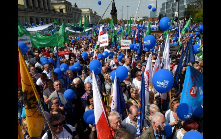 VARSOVIA, POLONIA (06/MAY/2017).- Decenas de miles de personas salieron a las calles el sábado en Varsovia para "defender la libertad" amenazada, según ellas, por el poder del nacionalista conservador Jaroslaw Kaczynski, constataron periodistas de la Afp."Queremos una Polonia democrática, proeuropea, orgullosa, que busca en la Unión Europea amigos y socios y no enemigos", declaró ante los manifestantes Grzegorz Schetyna, jefe del principal partido de la oposición, el centrista Plataforma Cívica (PO).Representantes de otras formaciones opositoras, sindicatos de profesores y representantes de diferentes autoridades locales también participaron en esta "Marcha de la libertad", organizada por el PO.El partido, según un sondeo de finales de abril, supera a los conservadores en intenciones de voto con el 31% de los apoyos, frente al 29%, por primera vez desde las elecciones de octubre de 2015.Los manifestantes se congregaron, bajo el sol, delante del ayuntamiento de Varsovia, antes de recorrer unos 2.5 km a lo largo de la principal arteria del centro de la capital polaca, hasta la plaza de la Constitución.Según la alcaldía de Varsovia, gobernada por Plataforma Cívica, 70 mil personas participaron en la marcha. Según la policía, nueve mil.Numerosos manifestantes enarbolaban banderas nacionales y de la Unión Europea."Entendemos la noción de libertad de forma diferente a Kazcynski, Erdogan, Putin o Lukashenko" -los presidentes turco, ruso y bielorruso, acusados de protagonizar una deriva autoritaria-, declaró Jacek Jaskowiak, alcalde de la ciudad de Poznan (oeste).Por su parte, Jaroslaw Kaczynski, jefe del partido Derecho y Justicia (PiS), en el poder, aseguró antes de la manifestación, en Szczecin (noroeste), que "la libertad está presente (en Polonia) en todas las dimensiones practicadas en los países democráticos"."Participando en esta marcha (...) desfiláis a contracorriente", agregó.La protesta responde a una serie de leyes y diligencias de los conservadores contra el Tribunal Constitucional, el sistema judicial, la democracia local, la educación, el medioambiente, la función pública, los medios de comunicación y otras instituciones democráticas, que han causado preocupación en la Unión Europea.La Comisión Europea ha advertido en varias ocasiones al gobierno polaco de que algunas de sus reformas atentaban contra el Estado de Derecho.