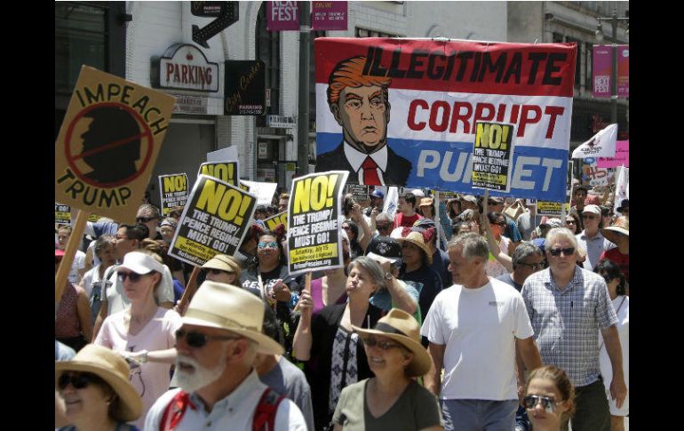 GUADALAJARA, JALISCO (03/JUL/2017).- Miles de personas salieron a las calles ayer en 46 ciudades estadounidenses para solicitar al Congreso que inicie el proceso de destitución del presidente Donald Trump.Las marchas, convocadas por activistas de derechos humanos, también fueron el escaparate para protestar contra las medidas del republicano en materia de migración, así como sus negocios en el extranjero, la posible injerencia rusa en los comicios presidenciales de 2016 y la supuesta obstrucción a la investigación de este caso, entre otros temas.“La obstrucción a la justicia y el haber violado la ‘cláusula de salarios extranjeros’ son ambas razones constitucionales para que el Congreso investigue y destituya al presidente”, declaró Tudor Popescu, del grupo Indivisible CA D-39, uno de los organizadores de la manifestación que tuvo lugar en la ciudad de Los Ángeles.Fue precisamente en esta metrópoli en la que se contabilizaron más participantes, alrededor de 10 mil personas según los organizadores, aunque en otras ciudades del país se estima que la concurrencia no fue tan grande como se esperaba.También se sumaron a las movilizaciones grupos en favor de las políticas del mandatario.