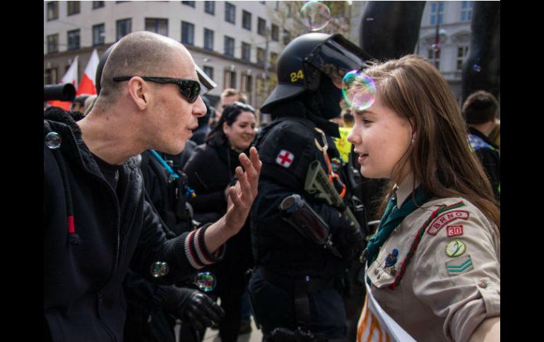 GUADALAJARA, JALISCO (03/MAY/2017).- Una fotografía de una niña scout que le hace frente a un manifestante de extrema derecha en la República Checa se volvió viral tras ser compartida miles de veces.La imagen fue capturada por el fotógrafo Vladimír Cicmanec en una manifestación del 1 de Mayo y después fue compartida por la Organización Munidal de Scouts (World Organisation of the Scout Movement).El evento fue organizado por el DSSS Partido del Trabajo, un partido de extrema derecha en la República Checa, al que después más personas se unieron para protestar pacíficamente y mostrarse contra ese grupo político."Personas de distintos orígenes, entre ellas scouts, salieron a las calles durante una marcha de extrema derecha para expresar su apoyo a los valores de la diversidad, paz y comprensión", publicó la Organización de Scouts cuando compartió la imagen.El fotógrafo Vladimír Cicmanec detalló que el manifestante estaba claramente molesto con Lucie, la scout, pero que ella simplemente no se amendrentó ni se movió del sitio."Pensé que sería una buena foto, inicialmente la compartí en Facebook sin pensar mucho en ella, hasta que las personas me pidieron hacerla pública y la imagen explotó" contó según The Independent.La fotografía recuerda a la de la mujer que se enfrentó a policías el año pasado durante una marcha por la muerte de dos hombres negros a manos de la policía en Louisiana EU y más recientemente, a la de otra mujer que encaró a un manifestante radical en otra marcha en Birmingham, Inglaterra.EL INFORMADOR / MARÍA JOSÉ VILLANUEVA